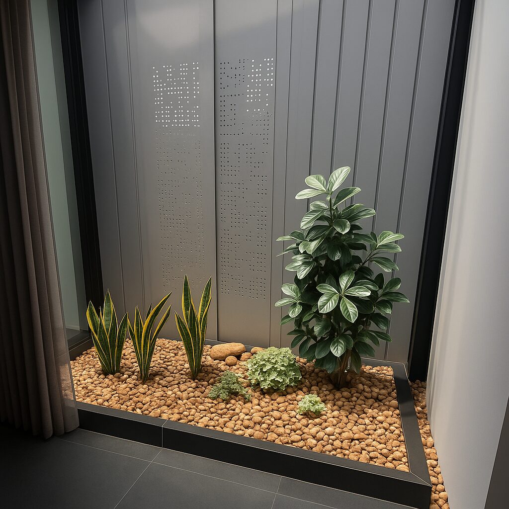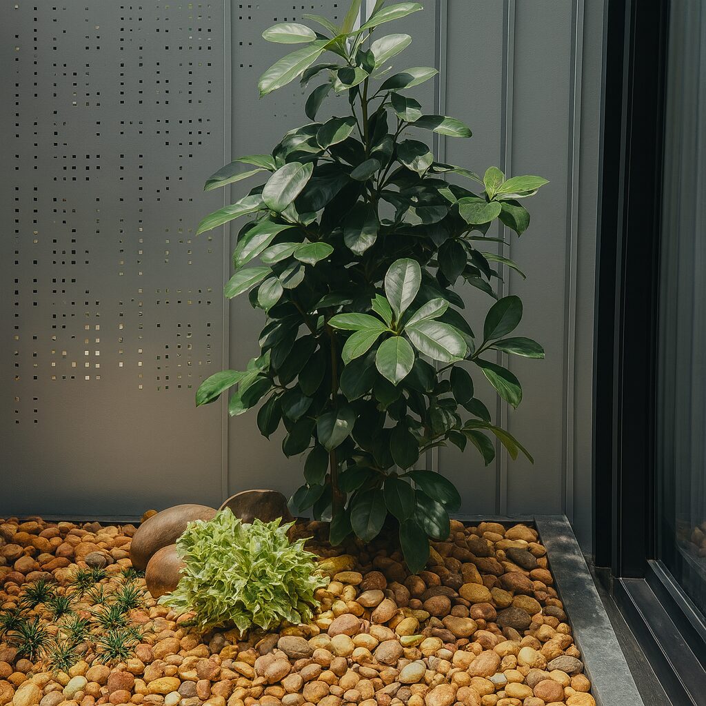Each plant cluster has been strategically placed to enhance scale and softness — from the sculptural Ficus and Schefflera near the glass panels to the lush Sansevieria borders that add clean, vertical accents. The natural brown pebble base complements the modern grey interiors, creating an earthy contrast that adds warmth.