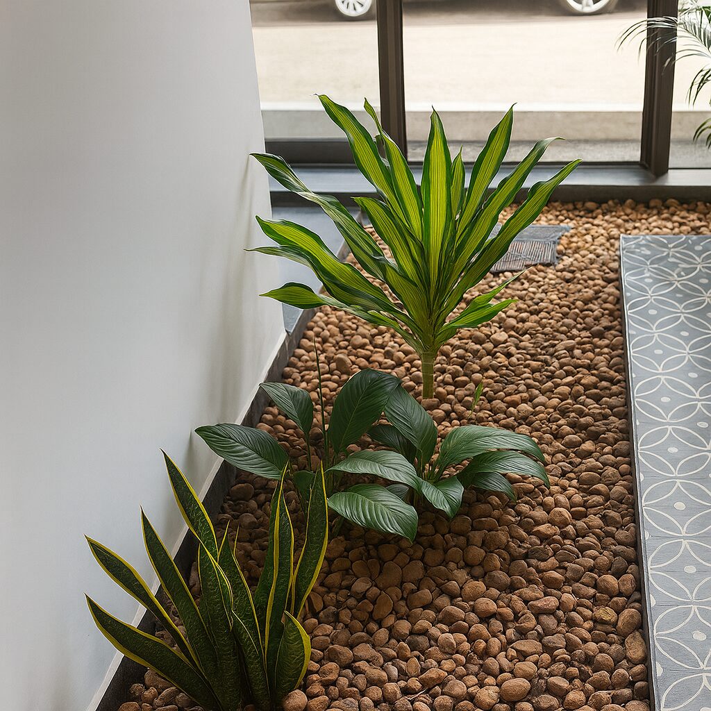 Indoor pebble gardens with Ficus, Dracaena, Peace Lily, and Areca Palm