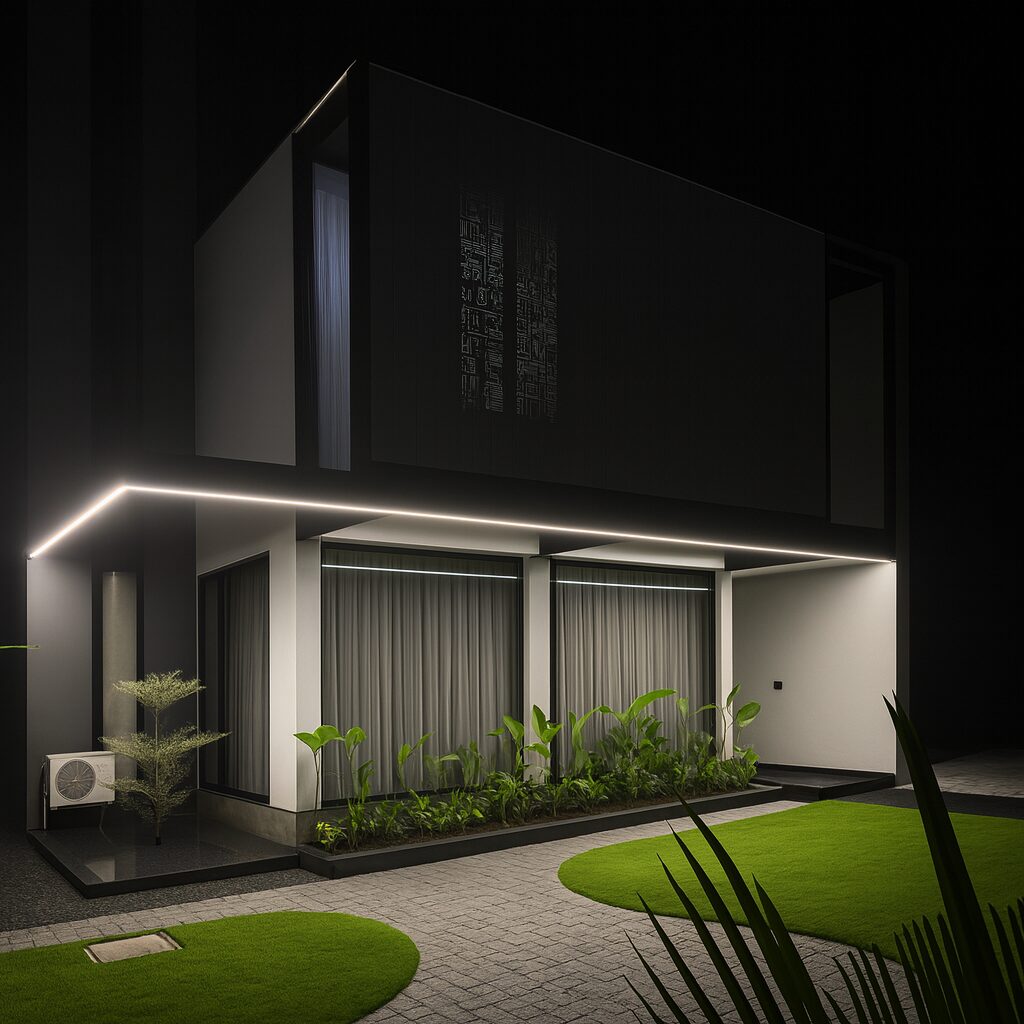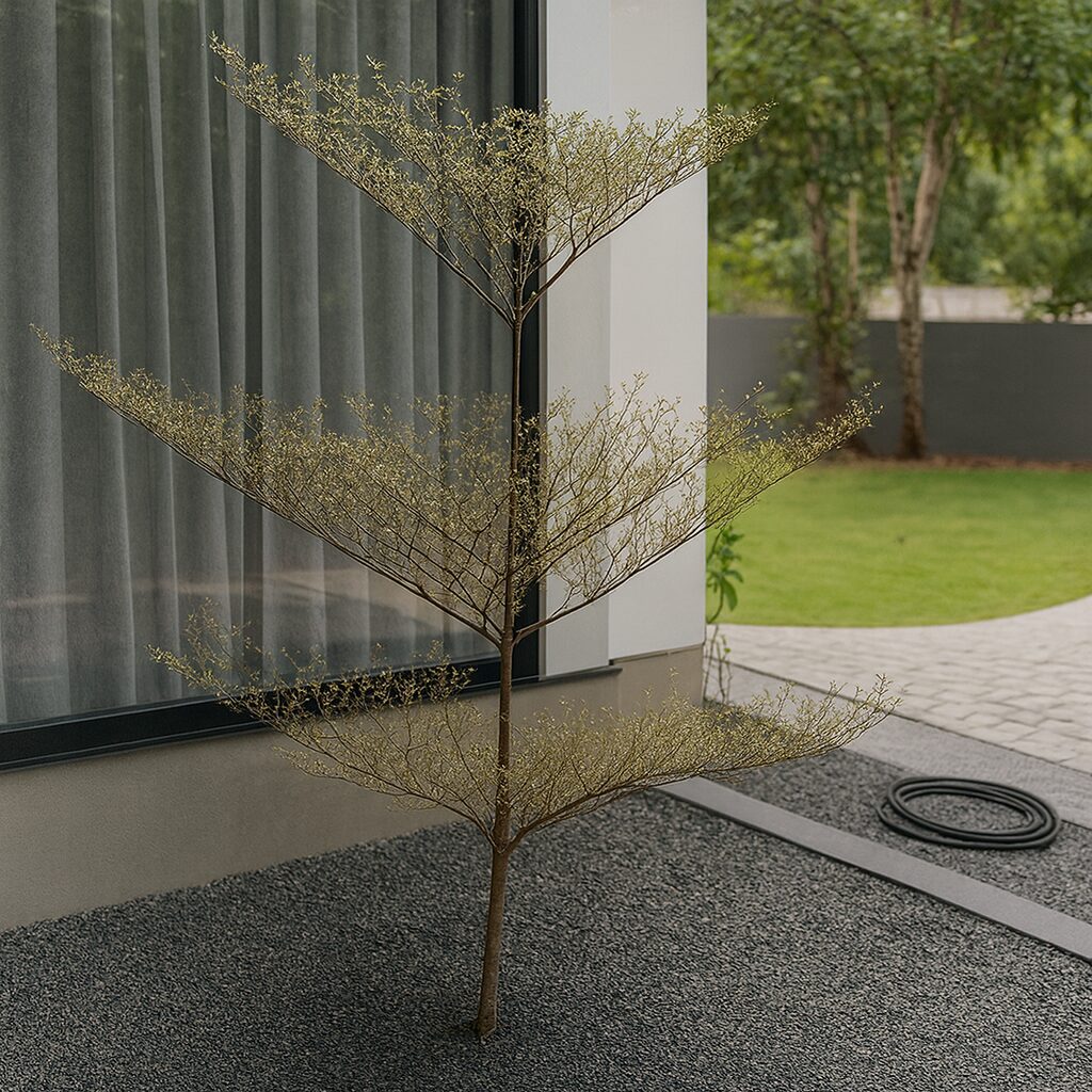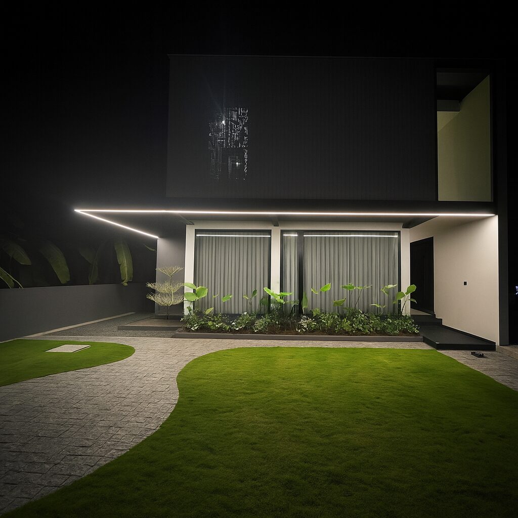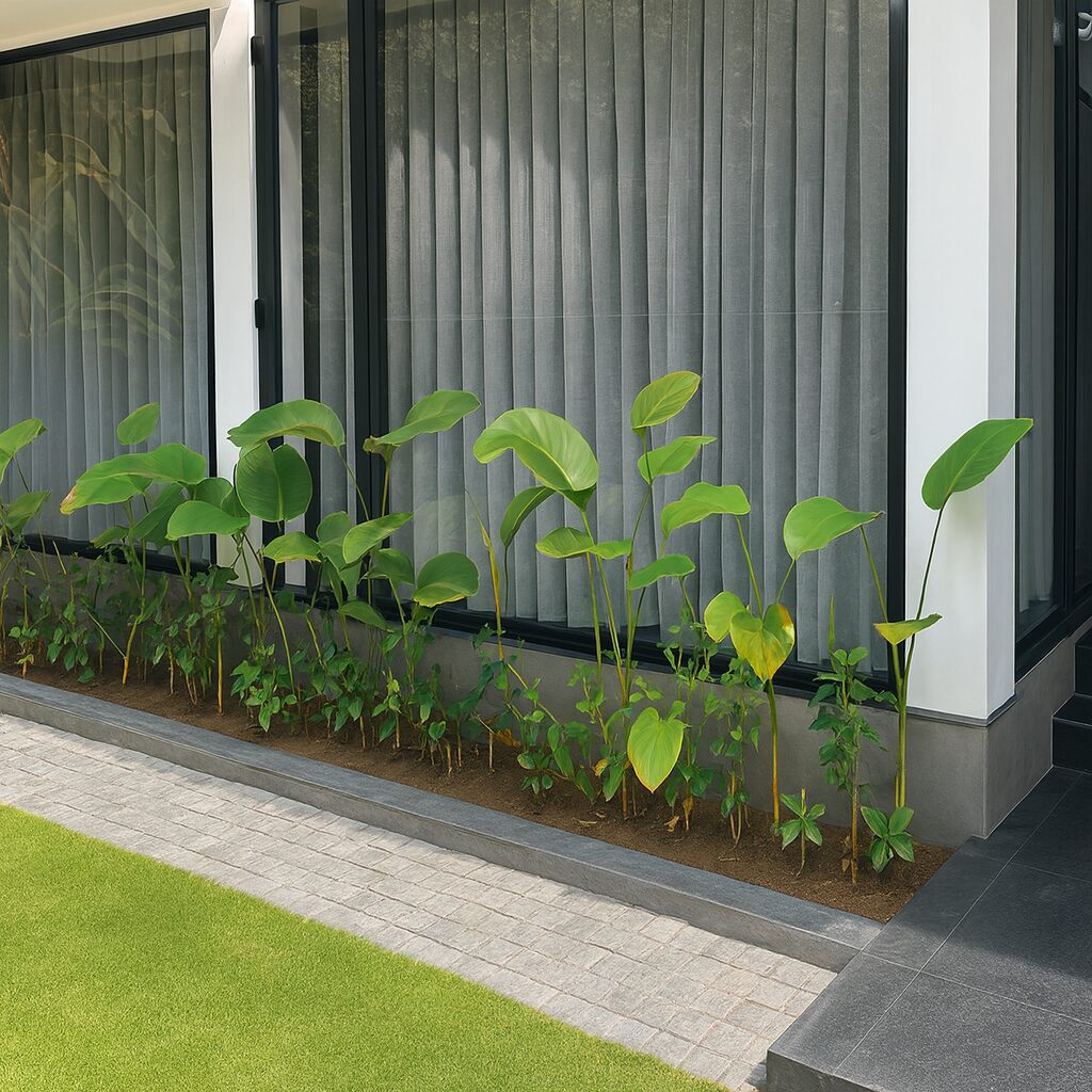 Outdoors, a lush lawn with sculpted paving curves brings rhythm and openness to the landscape. A subtle mix of Calathea lutea, Colocasia, and tropical foliage lines the façade, while the minimalist tree installation adds a sculptural, architectural touch — defining the home’s clean, modern identity.