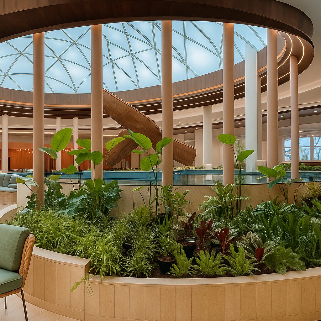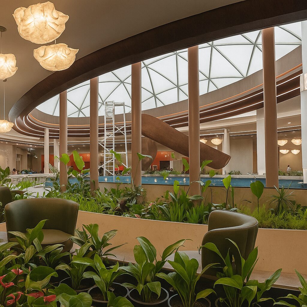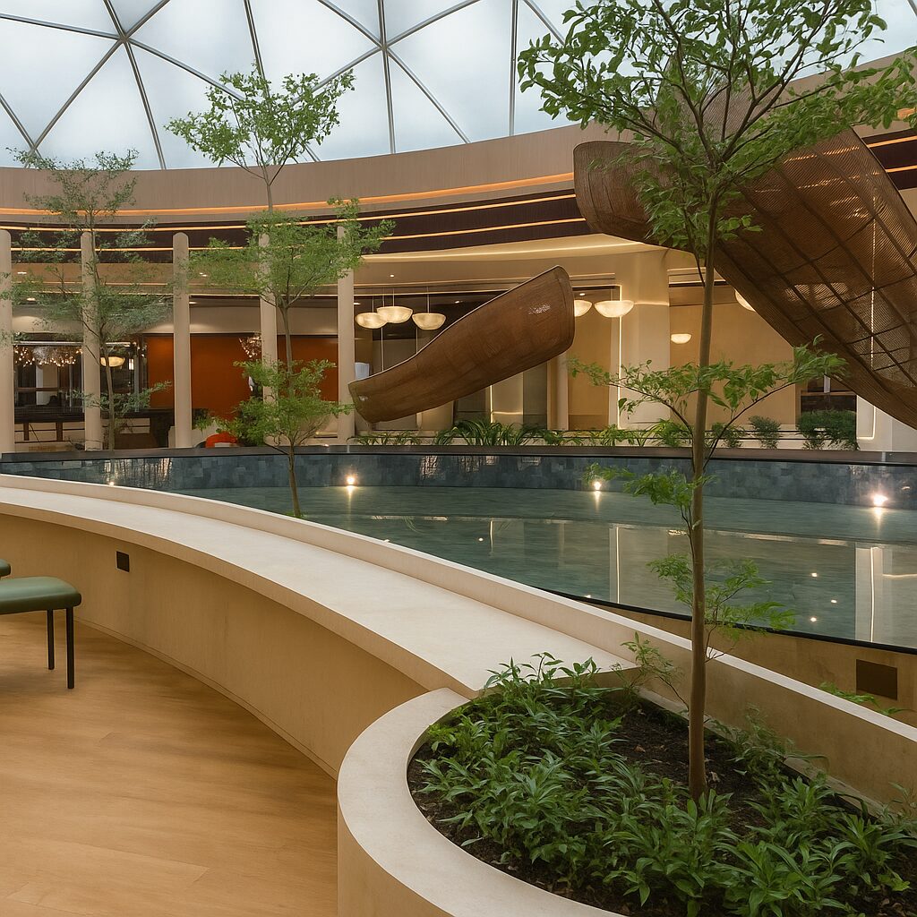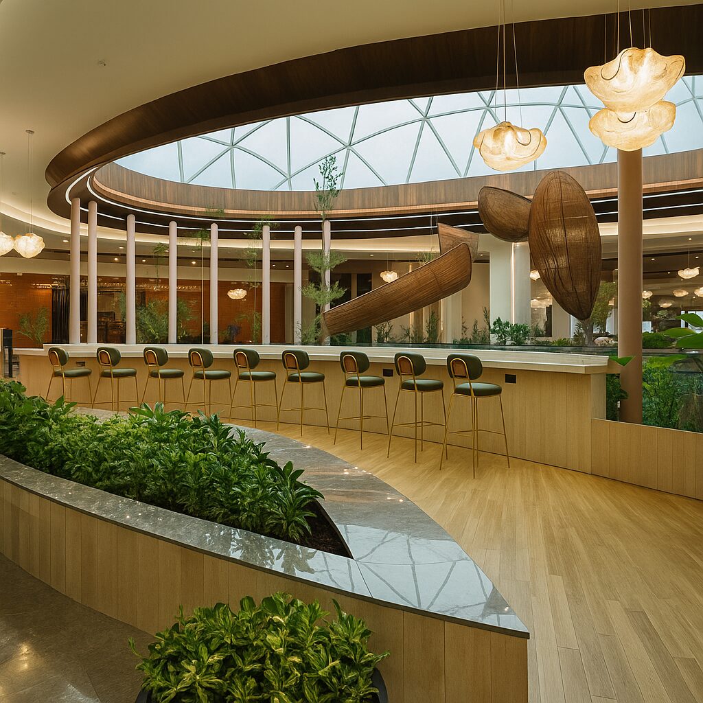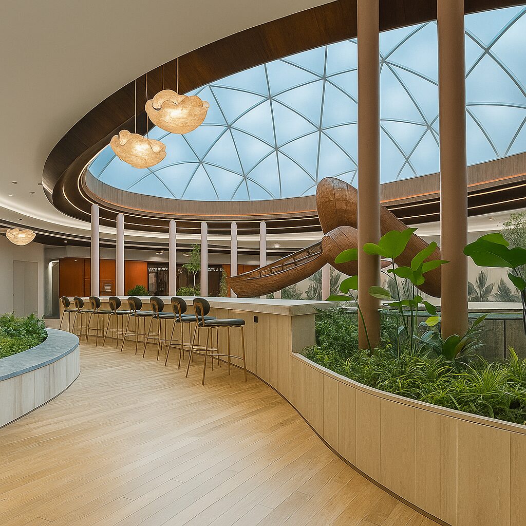 Under the majestic glass dome atrium, lush tropical plants thrive in harmony with the organic forms of furniture and interiors. The entire space evokes a calm, oxygen-rich environment, designed to refresh travelers and offer a sense of luxury and wellness through nature.