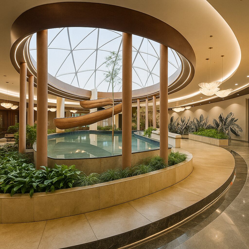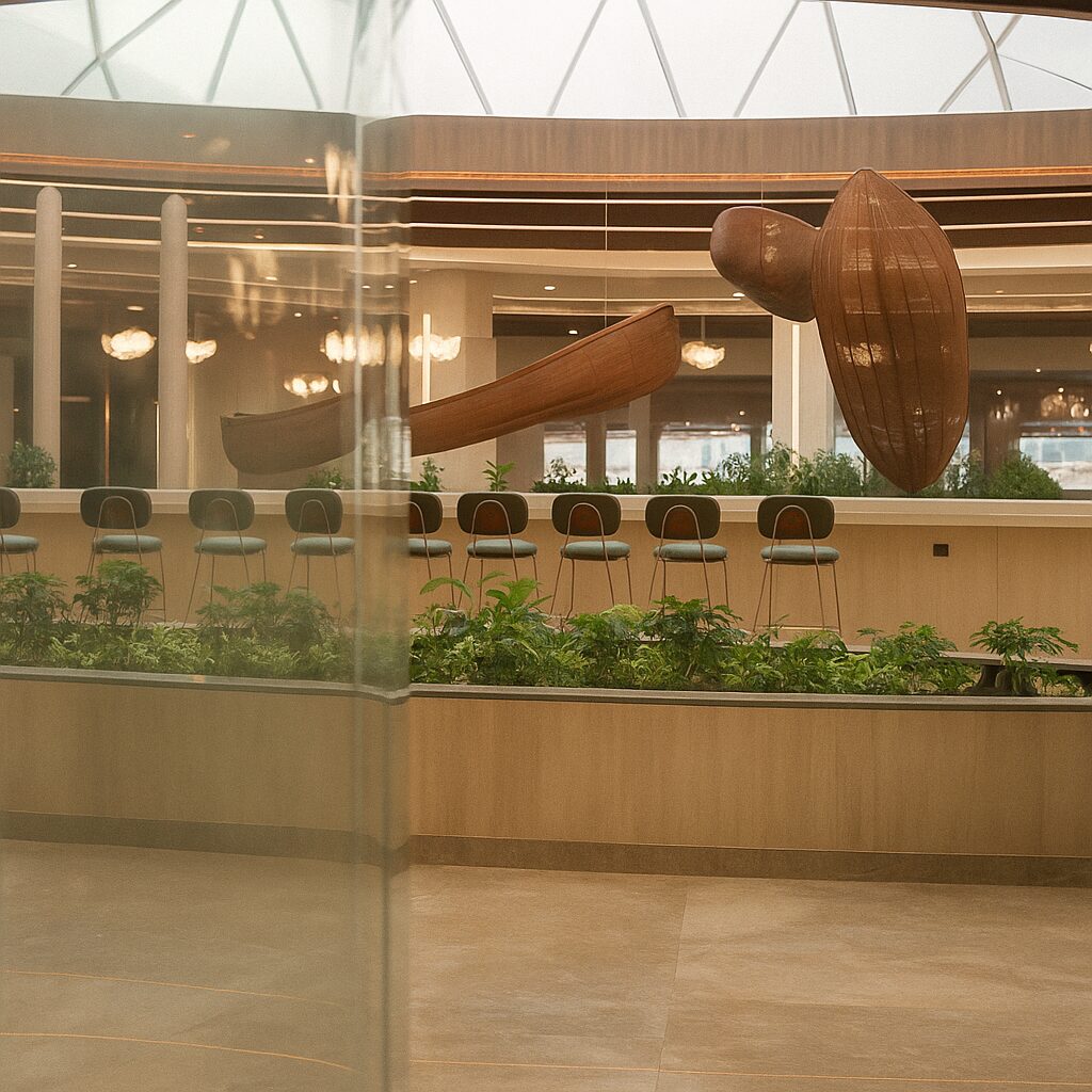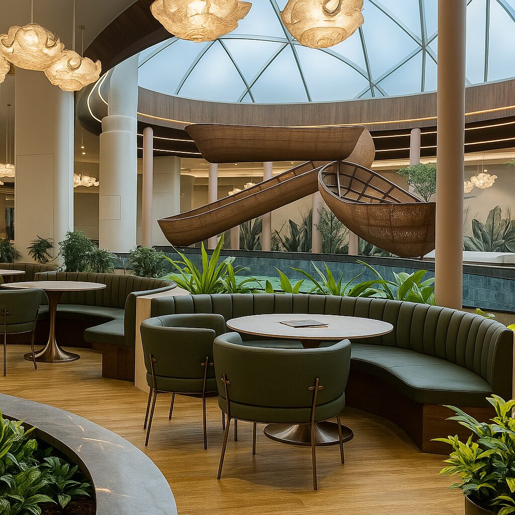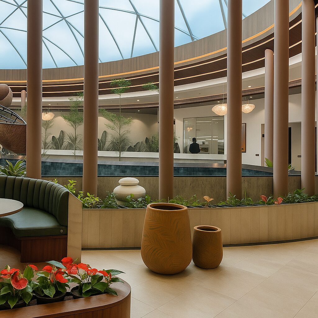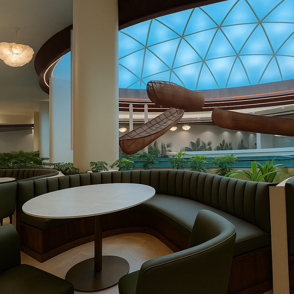 Under the majestic glass dome atrium, lush tropical plants thrive in harmony with the organic forms of furniture and interiors. The entire space evokes a calm, oxygen-rich environment, designed to refresh travelers and offer a sense of luxury and wellness through nature.