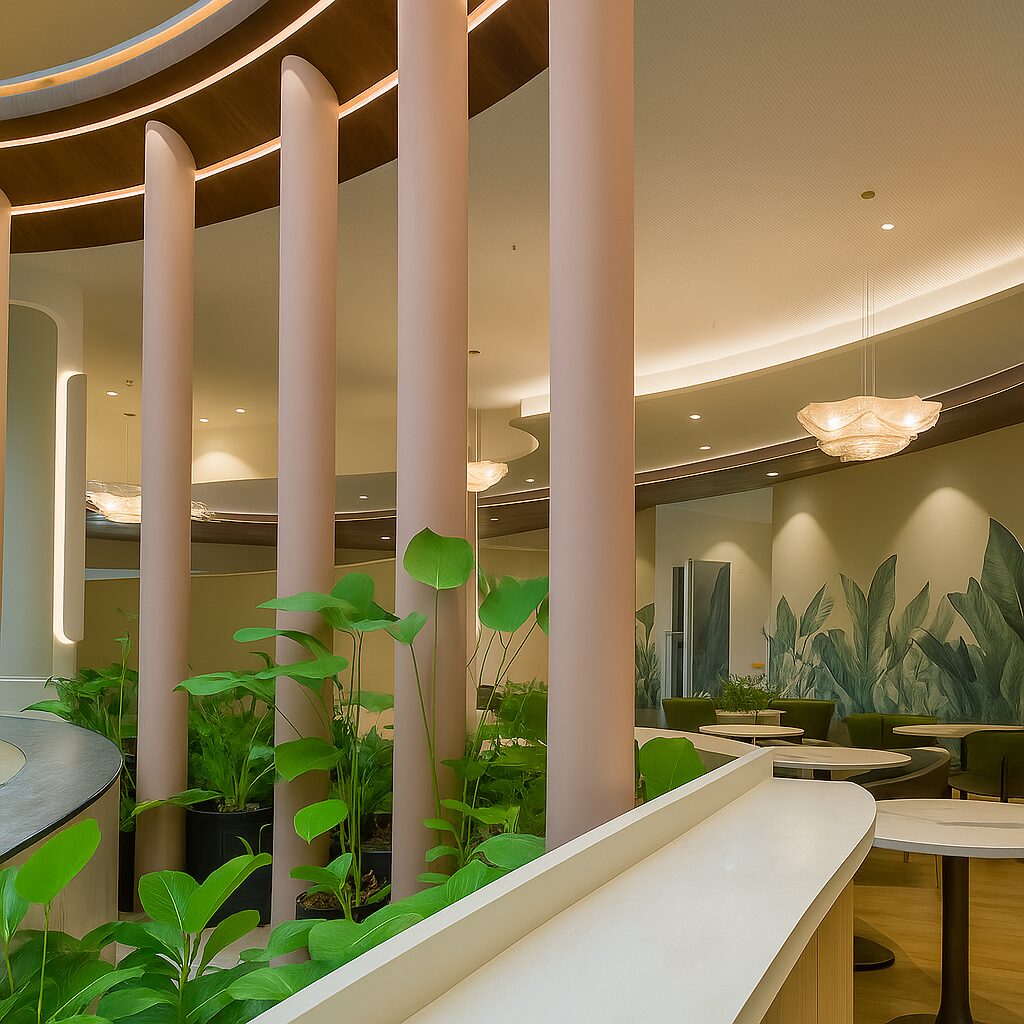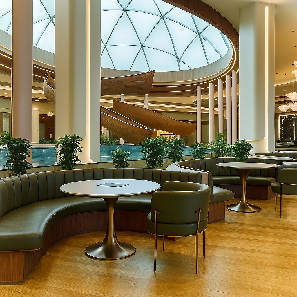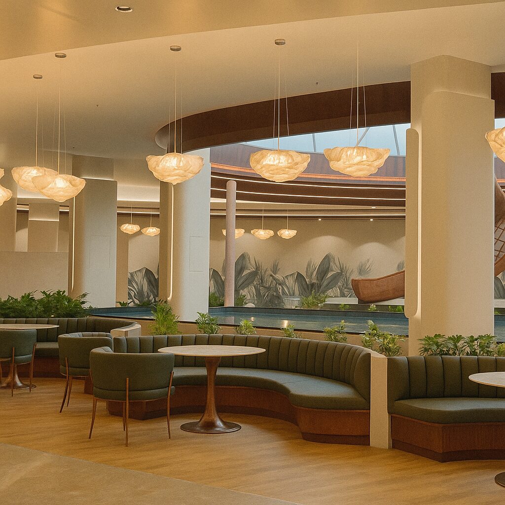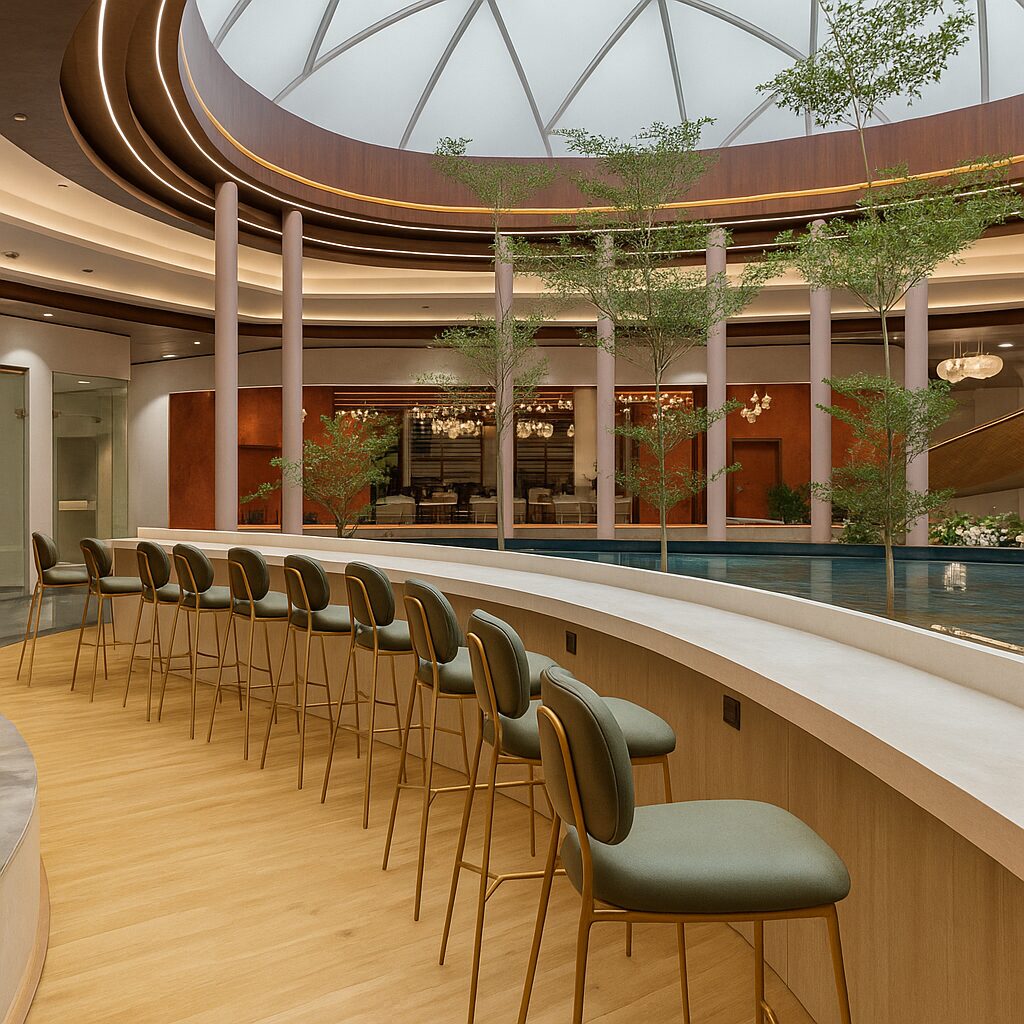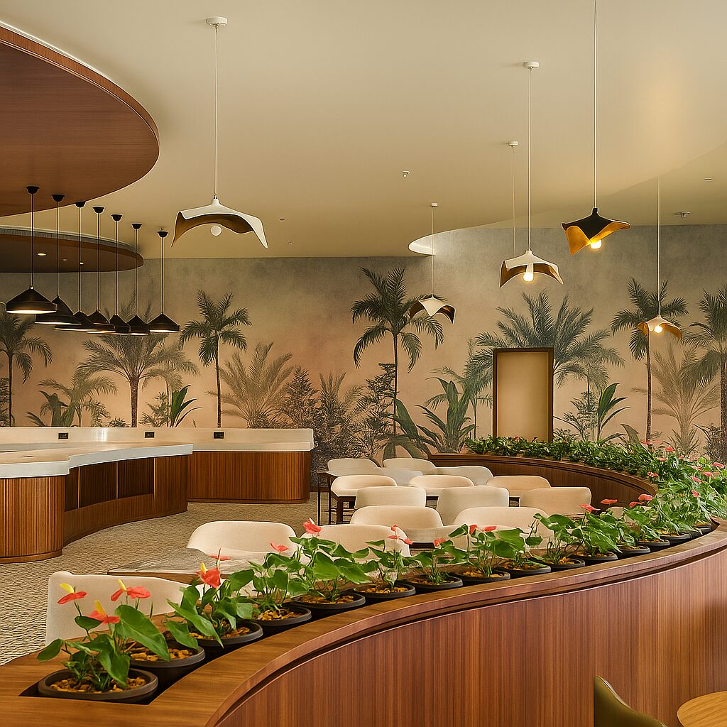 Under the majestic glass dome atrium, lush tropical plants thrive in harmony with the organic forms of furniture and interiors. The entire space evokes a calm, oxygen-rich environment, designed to refresh travelers and offer a sense of luxury and wellness through nature.