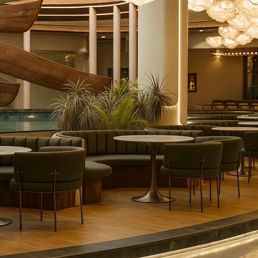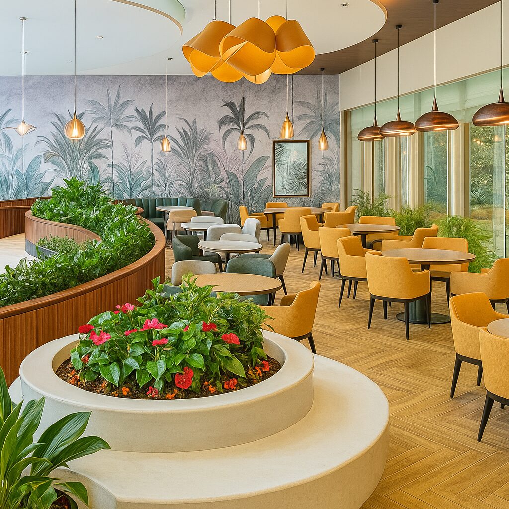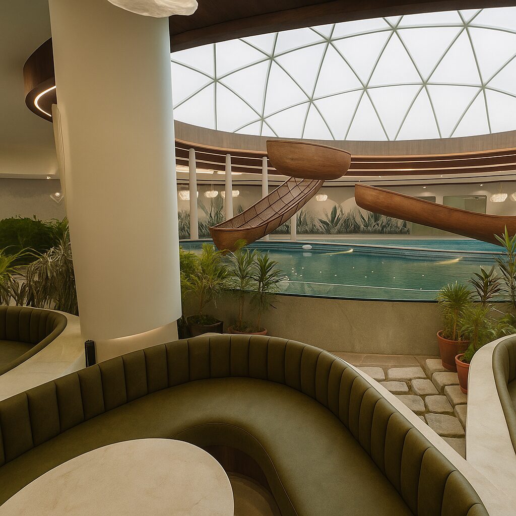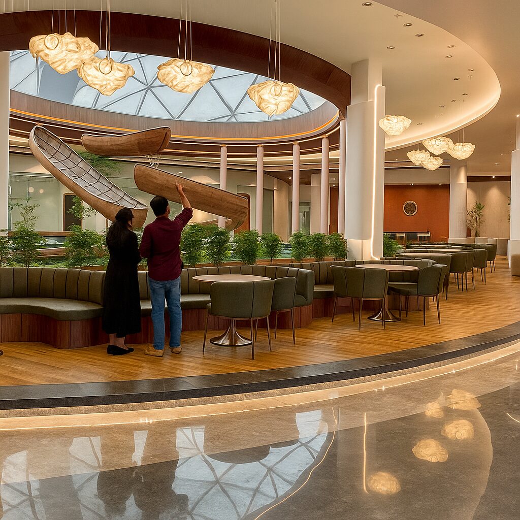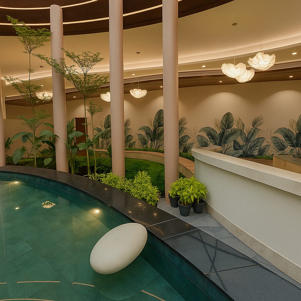 Under the majestic glass dome atrium, lush tropical plants thrive in harmony with the organic forms of furniture and interiors. The entire space evokes a calm, oxygen-rich environment, designed to refresh travelers and offer a sense of luxury and wellness through nature.