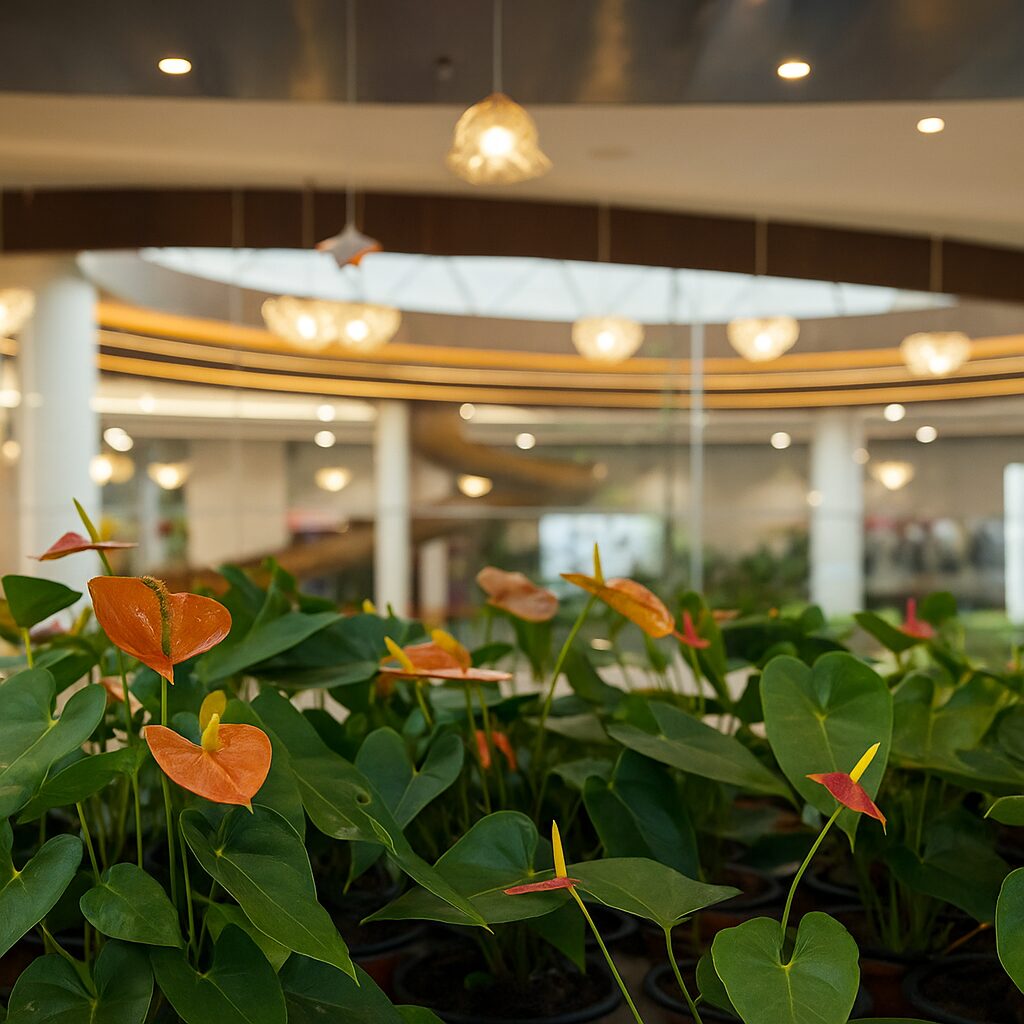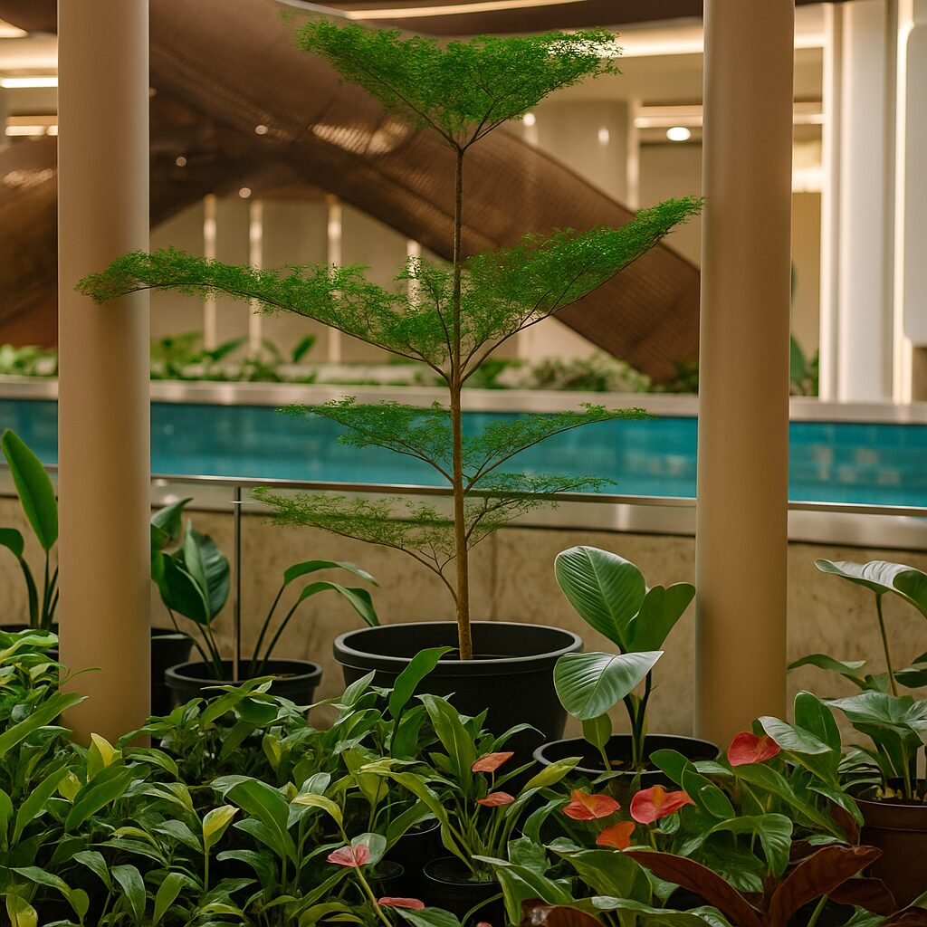 Central Green Courtyard: A curated tropical zone beneath the skylight featuring statement species and balanced foliage composition.