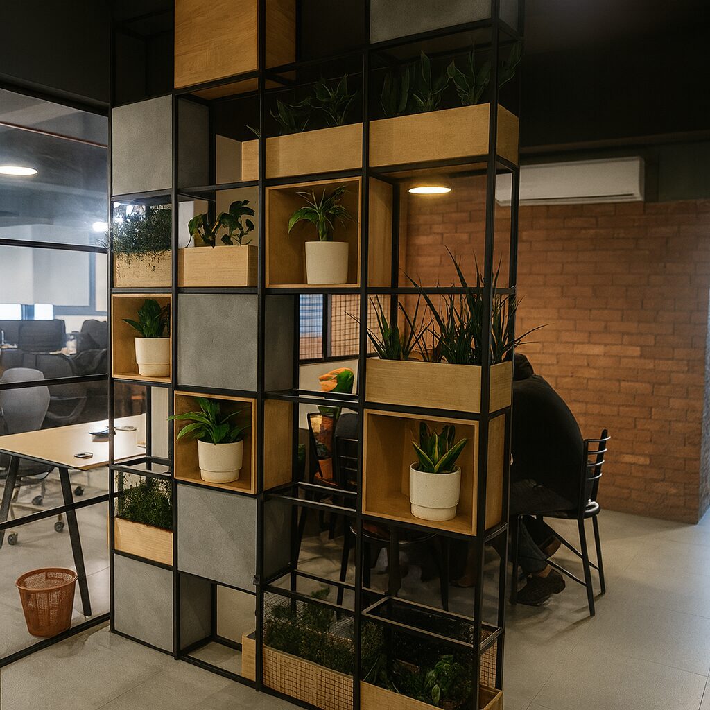 Absolutely. The concept can be adapted to compact office spaces, reception areas, or co-working environments using scaled-down partitions and planters.