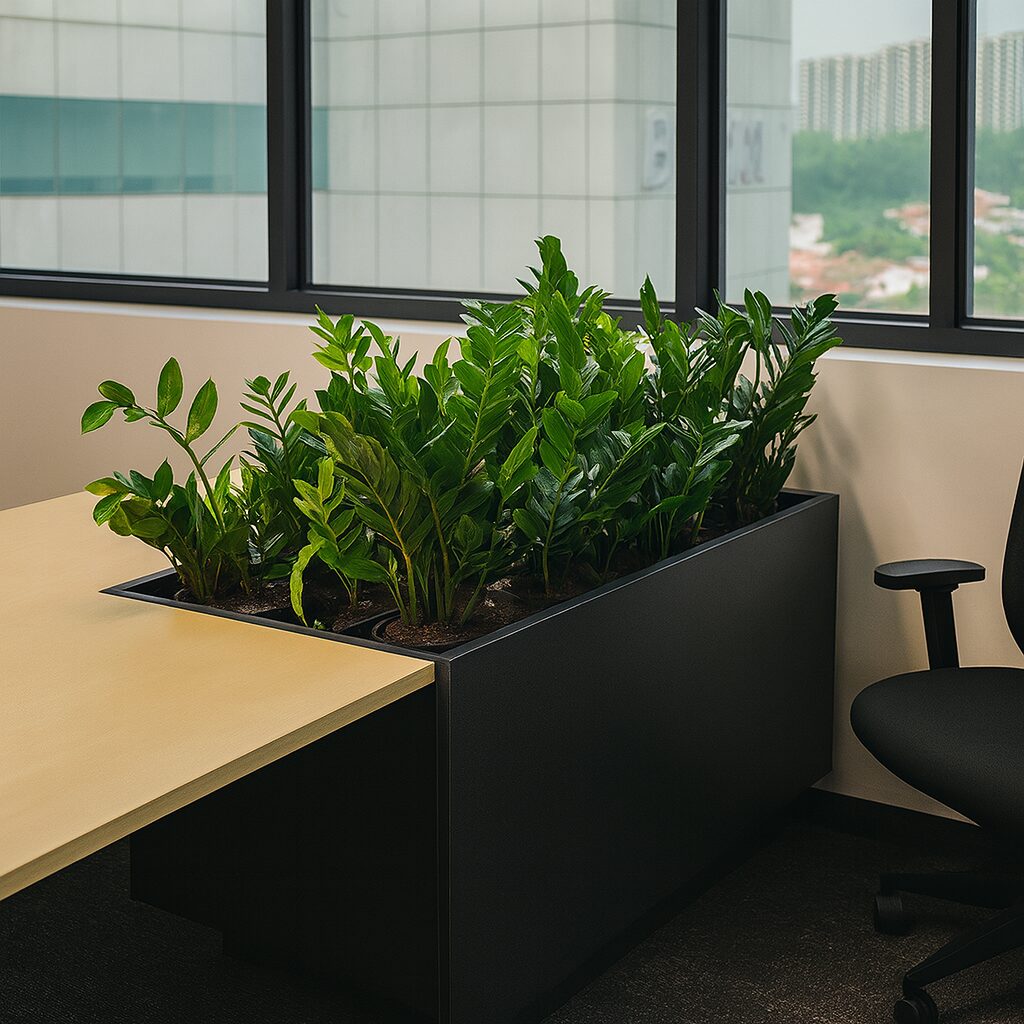 Each planter has been customized to blend seamlessly with the office furniture, using neutral grey and black tones that complement the minimalist design language. The placement of greenery enhances visual balance and naturally divides collaborative spaces without obstructing openness or light.