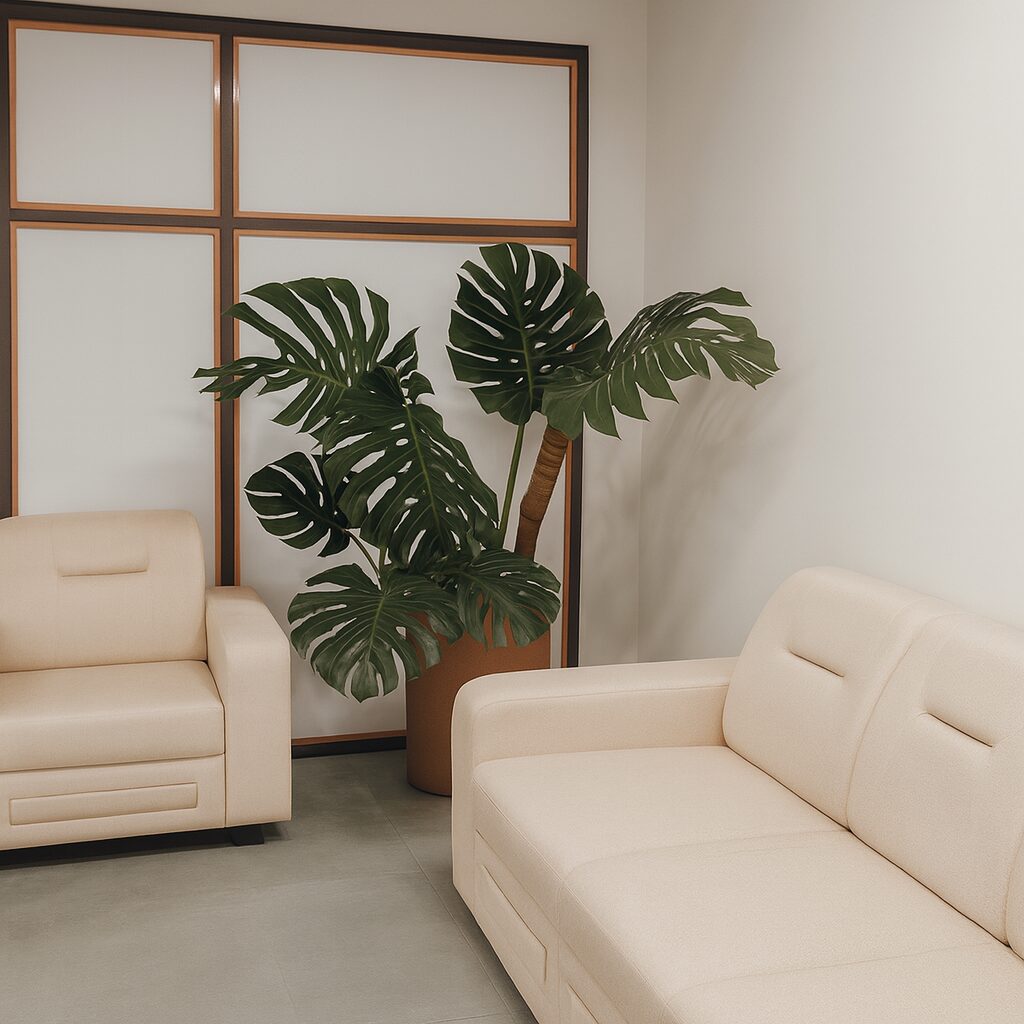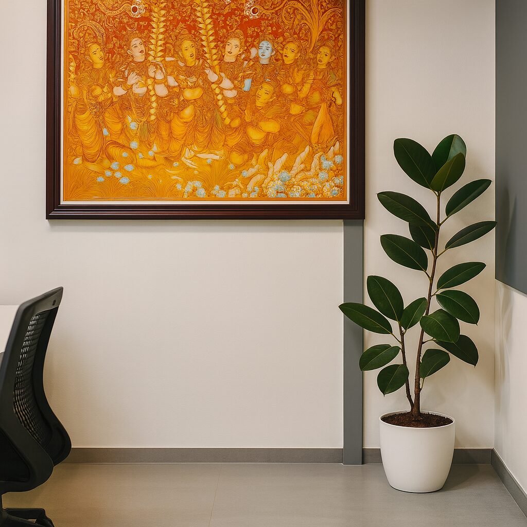 An elegant plant rental installation curated by Hug A Plant for the office interiors of Gosree Finance Limited, Kakkanad. The project focuses on adding a sense of calm and freshness to the corporate environment through the placement of selected indoor plants in premium white pots.