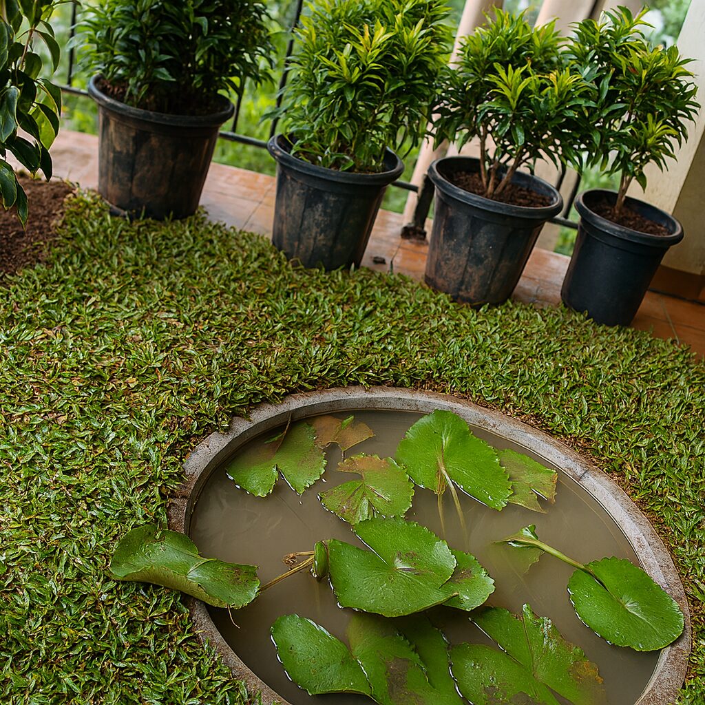 The layout features a soft natural grass base paired with a circular lotus pond, creating a peaceful focal point that adds balance and movement. Hanging planters brimming with vibrant greens and seasonal blooms form vertical layers of texture and depth, enhancing privacy while maintaining openness to light and air. Together, these elements create a calm, low-maintenance green haven—ideal for morning tea, meditation, or simply unwinding amidst tropical freshness.