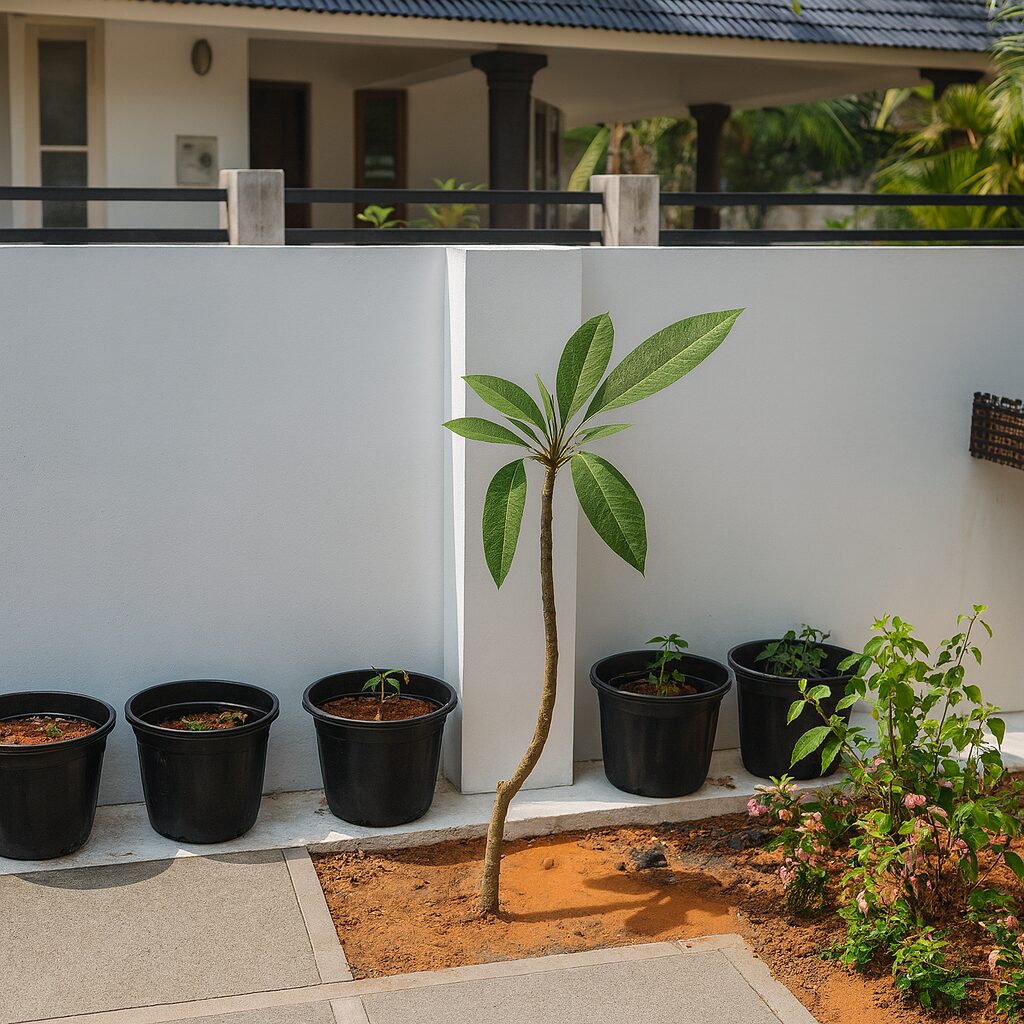 Each visual element — from the Frangipani focal tree surrounded by decorative pebbles to the lined flowering beds along pathways — contributes to a well-balanced tropical-modern aesthetic that suits Kerala’s climate and architecture perfectly.
