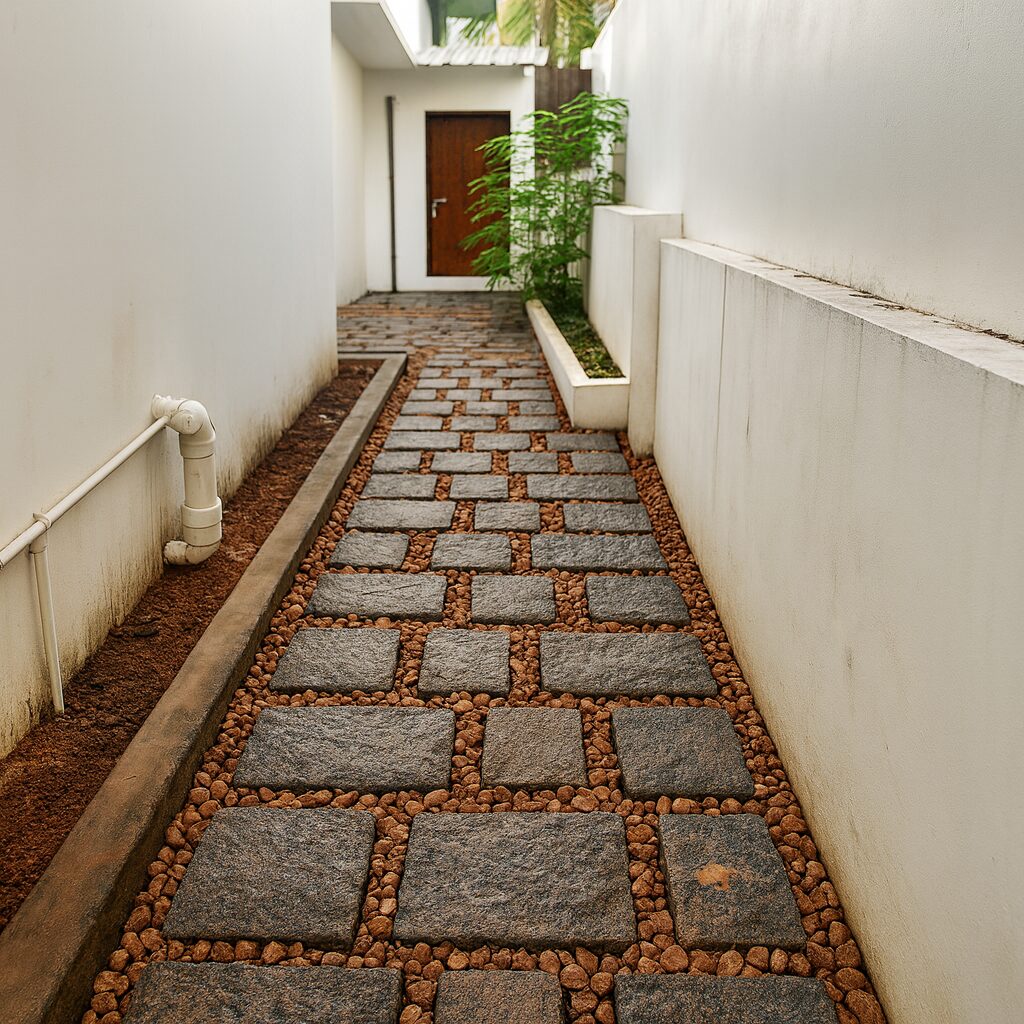 • Pebble-Lined Stone Pathway adding rustic warmth and textural charm