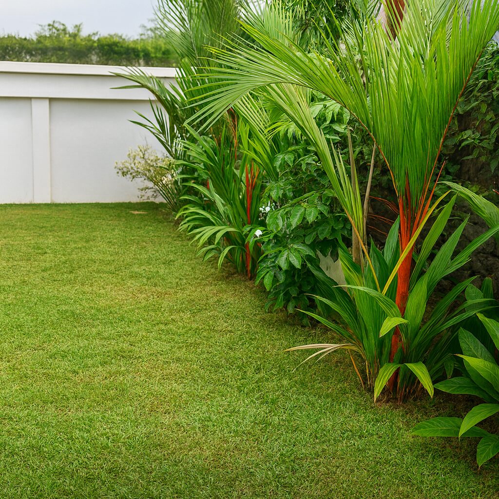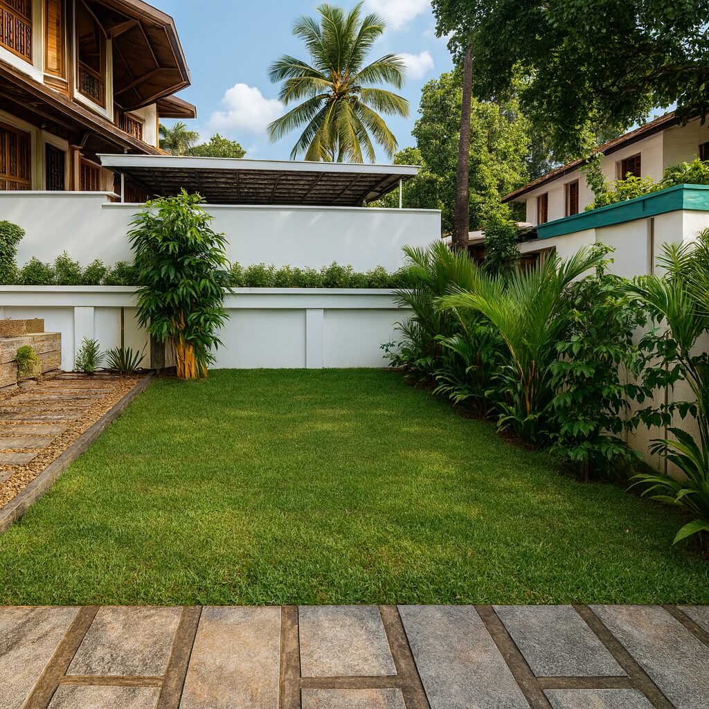 The design draws inspiration from Kerala’s tropical courtyard homes — where balance, light, and greenery coexist. The goal was to create a natural yet structured garden that complements the home’s clean architecture.