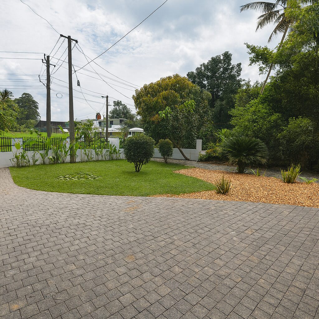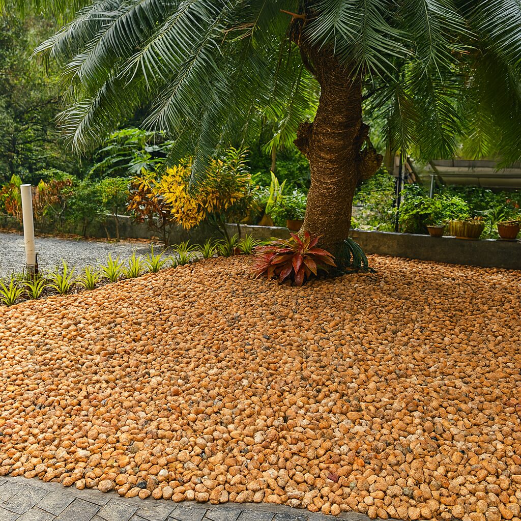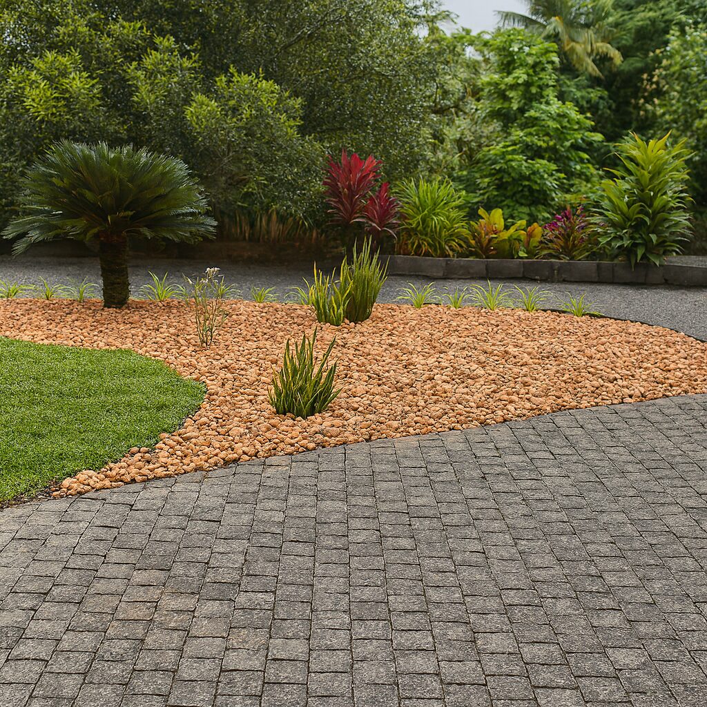 Interlocking pavers, natural river pebbles, and cement-finished curved edges were used for durability, contrast, and smooth integration with greenery.