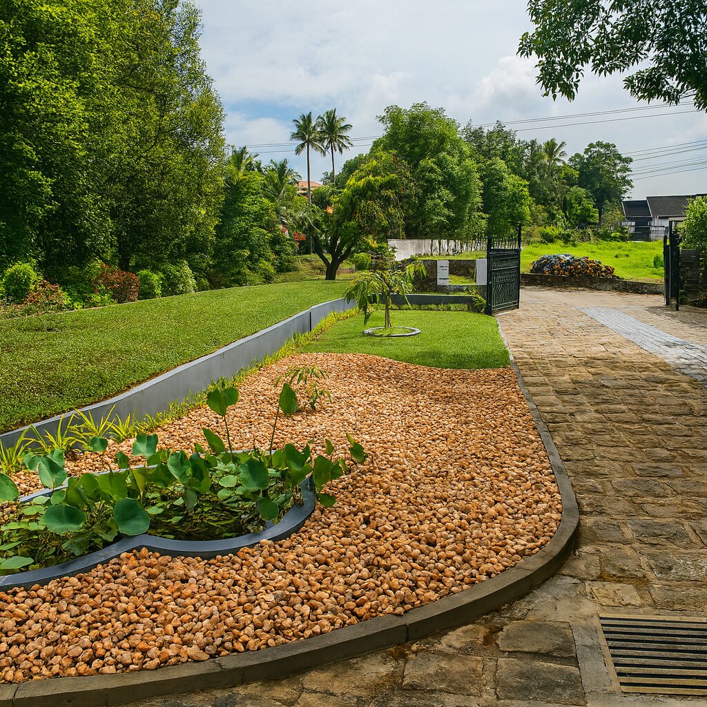A serene tropical retreat designed for Mr. Seby at Elavoor, where contemporary elegance meets Kerala’s lush natural charm. This layout blends soft green lawns, structured pebble zones, and vibrant tropical plants to create a peaceful yet vibrant outdoor living experience.