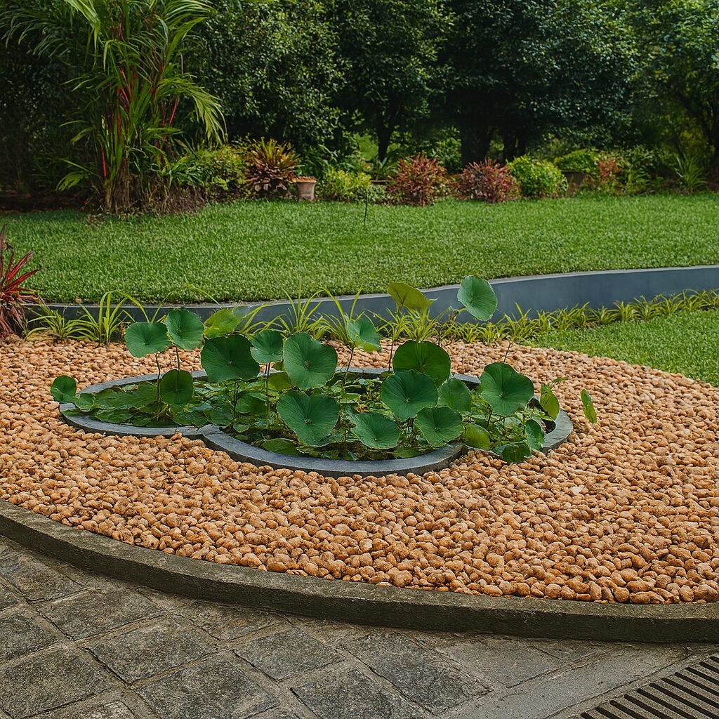 The design emphasizes balanced geometry and texture contrast — smooth stone pathways weaving through green lawns, pebble-filled beds defining corners, and accent ponds adding refreshing reflections. Each space is curated to celebrate openness and nature’s rhythm while maintaining easy maintenance and functional usability.