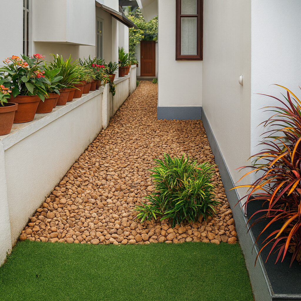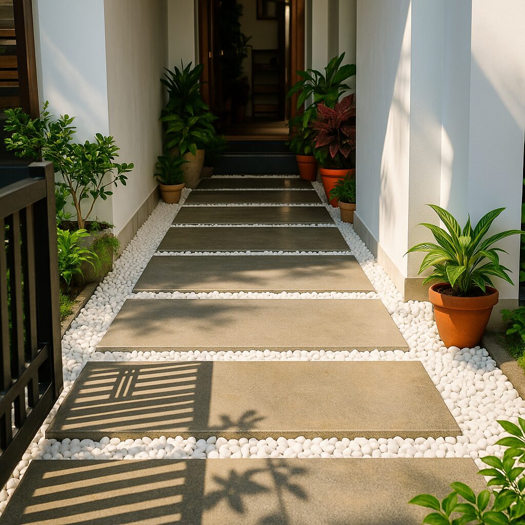 The entrance pathway features precisely aligned granite slabs bordered by white pebbles, creating a welcoming approach with a play of light and shadow. Around the residence, river pebble beds with structured stepping stones offer continuity and low-maintenance beauty, complemented by potted tropical foliage such as China Doll, Eugenia, and Aglaonema for year-round freshness.