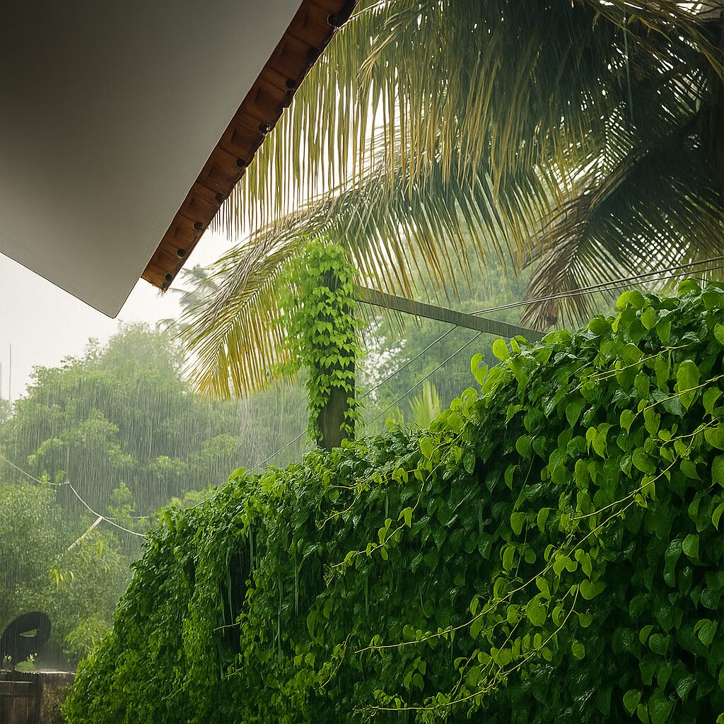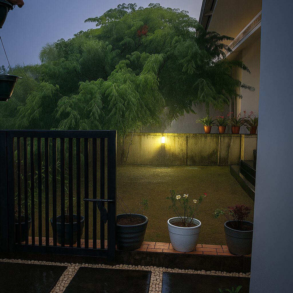 The design takes inspiration from Kerala’s tropical modern architecture, blending the simplicity of structured geometry with the tranquility of green living. Natural stone textures, open layouts, and layered foliage create a peaceful space that complements the home’s architecture.