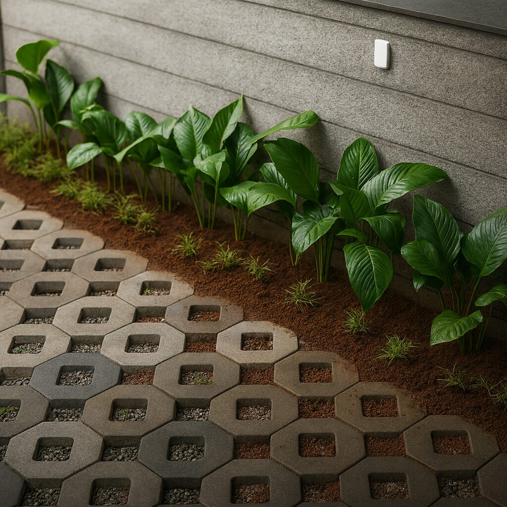 The design integrates Bird’s Nest Fern, Philodendron Xanadu, Alocasia, and Ginger Lily in curated clusters that thrive in partial shade and humid conditions. Each bed is carefully composed to emphasize lush foliage over floral color, creating a soothing palette of greens and earthy browns. The hexagonal concrete pavers and clean boundary walls give a modern contrast, while the newly laid Zoysia-type lawn and young trees add softness and continuity to the space.