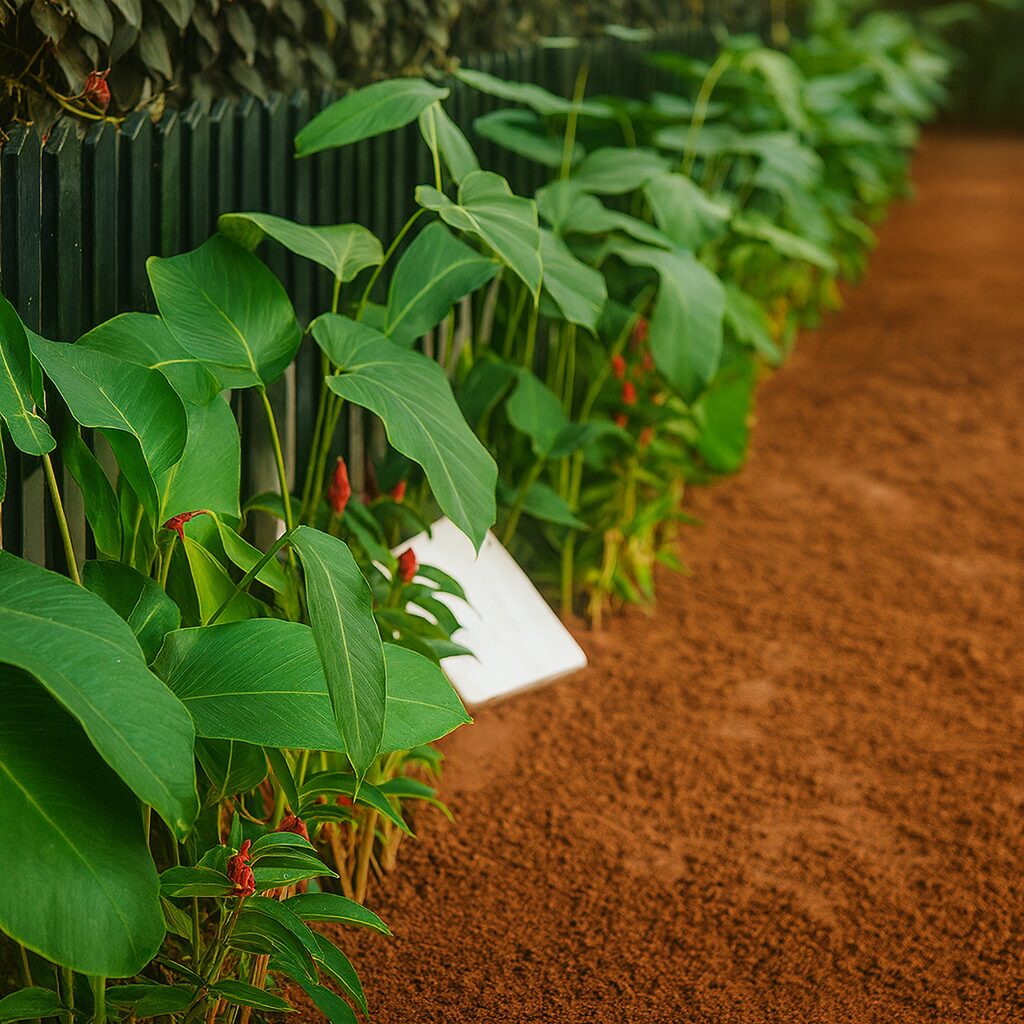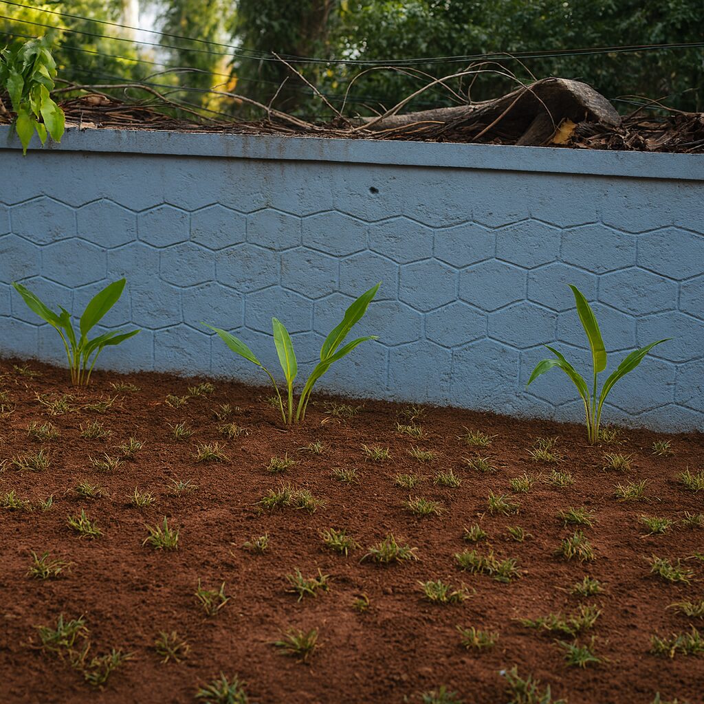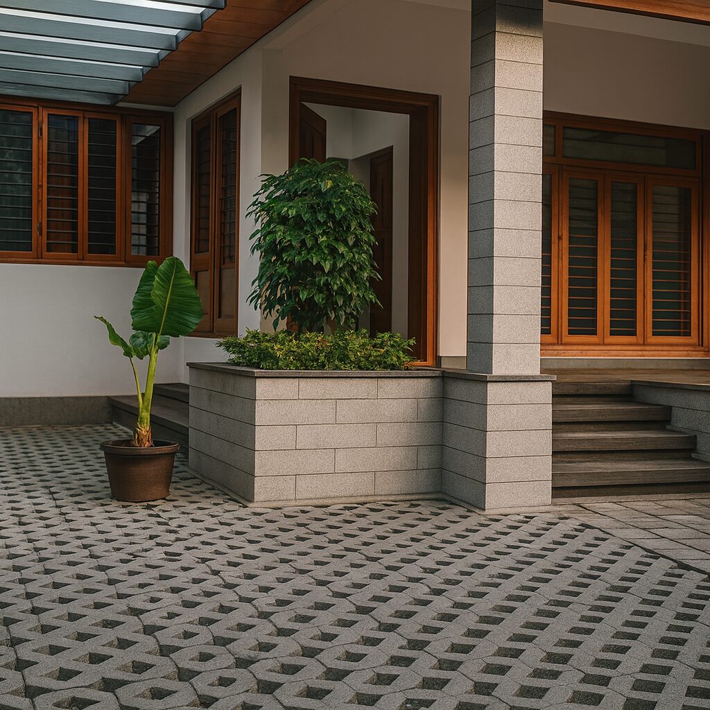 A refreshing tropical-modern landscape designed for Ms. Devika Shankar, Malayattoor, combining natural textures with minimalist geometry. This serene green space brings together soft-edged tropical plants, neat soil beds, and structured paver patterns, crafting a calm connection between the home’s architecture and its outdoor setting.