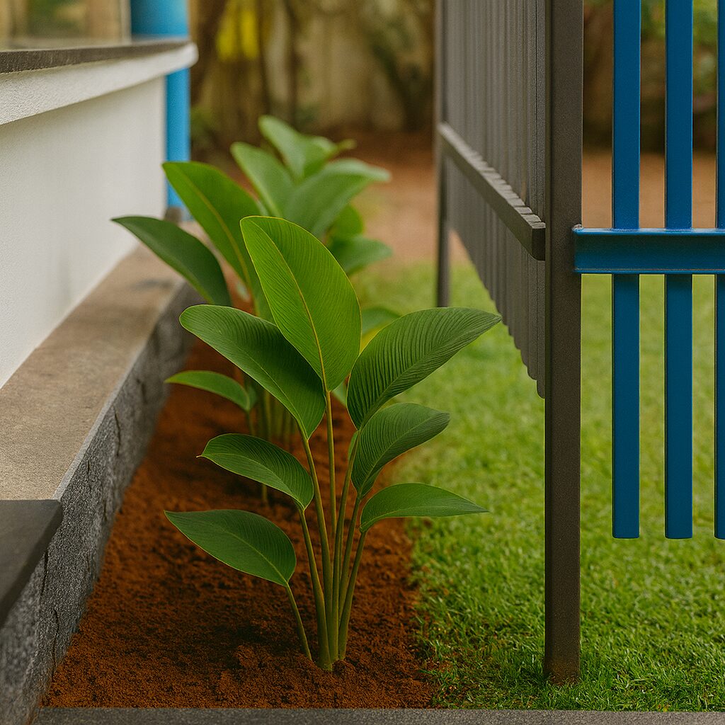 Compact tropical plants like Calathea lutea define the boundary edges, while curved lawn lines create visual playfulness. Together, they form a lush, low-maintenance setting that keeps the atmosphere lively and engaging for young learners.