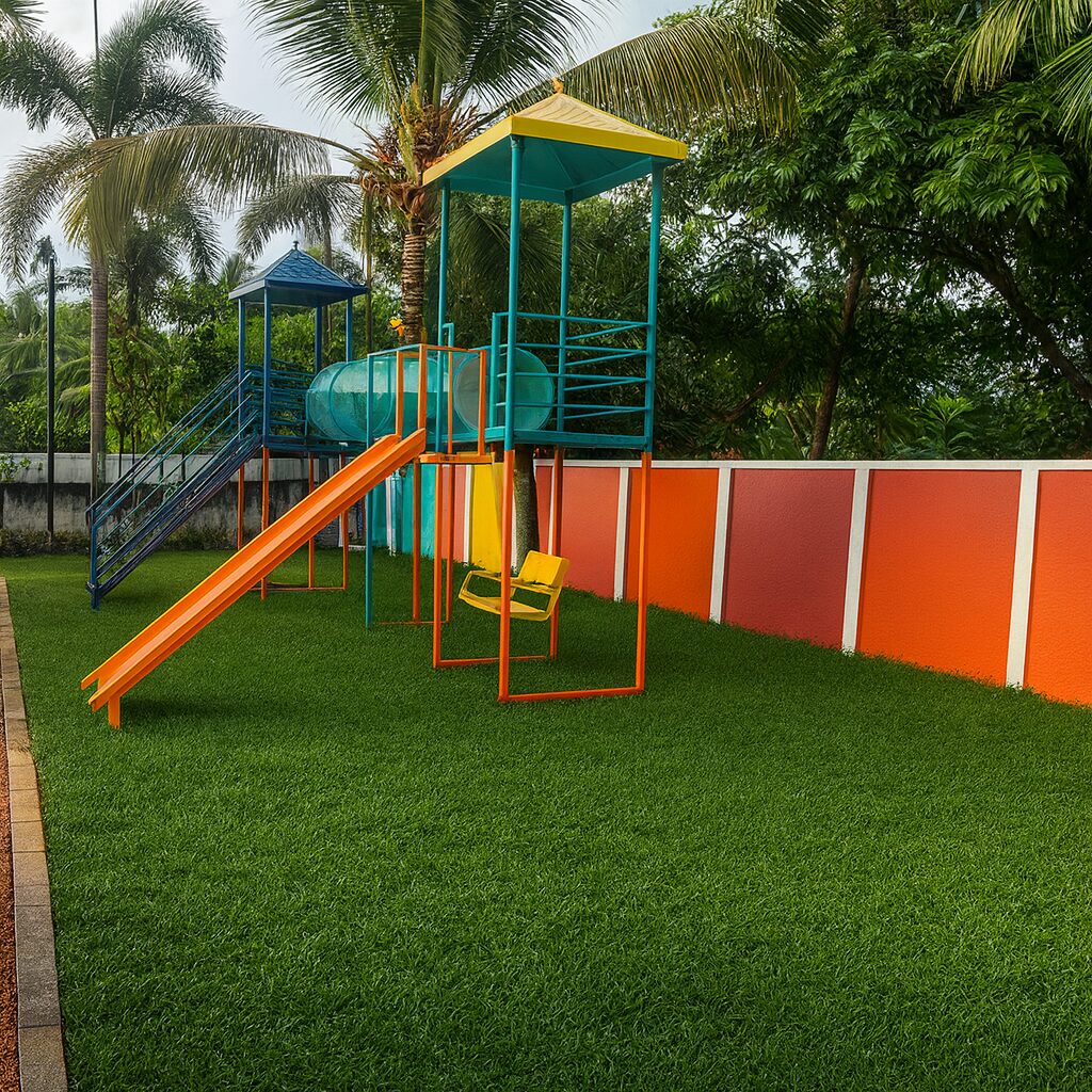 A cheerful and safe tropical play garden designed for Busy Bee Play School, Paravoor — blending bright architecture, soft greens, and playful textures to create a space full of joy and imagination.