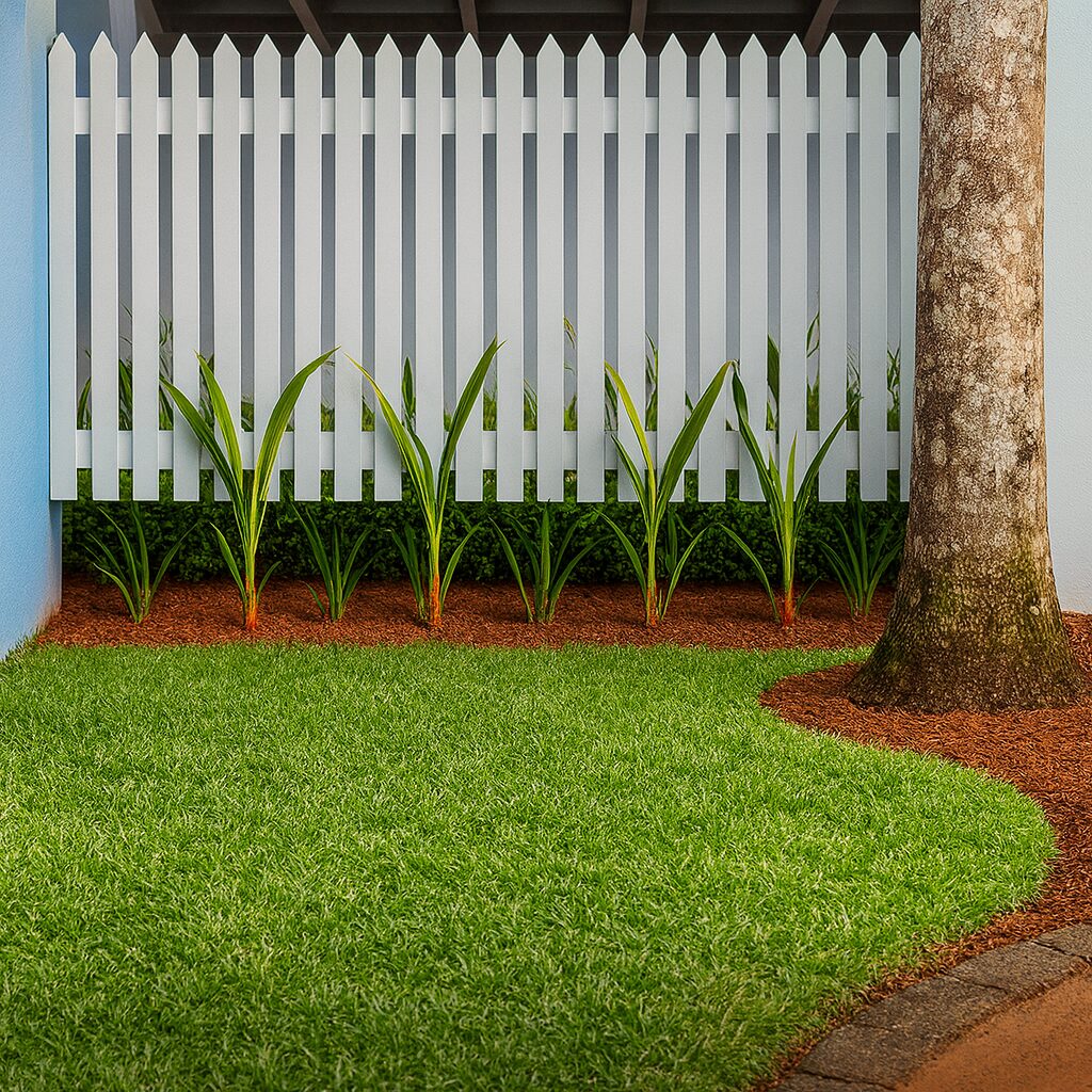 The landscape integrates vivid colors and structured greenery, reflecting the joyful spirit of a preschool. A neatly layered lawn offers a soft, cushioned play surface, while color-blocked fencing and metal play structures add vibrancy and rhythm. Each element — from tropical planting pockets to the clean white picket edges — is thoughtfully designed for safety, durability, and aesthetic appeal.