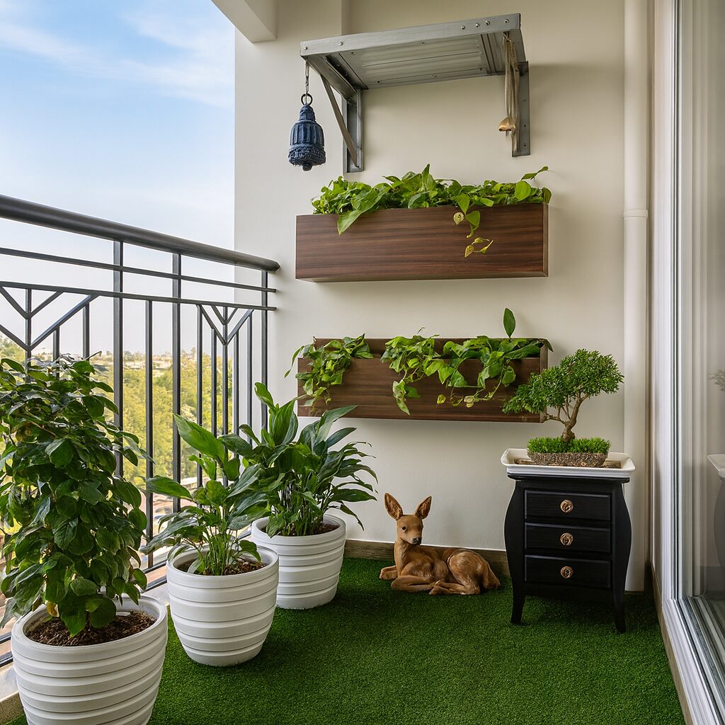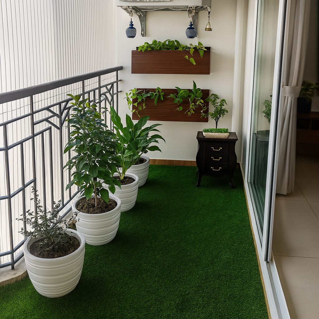 This design celebrates compact living — proof that even a small balcony can become a green sanctuary when thoughtfully planned.
