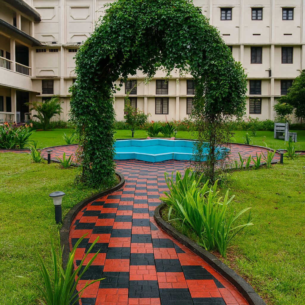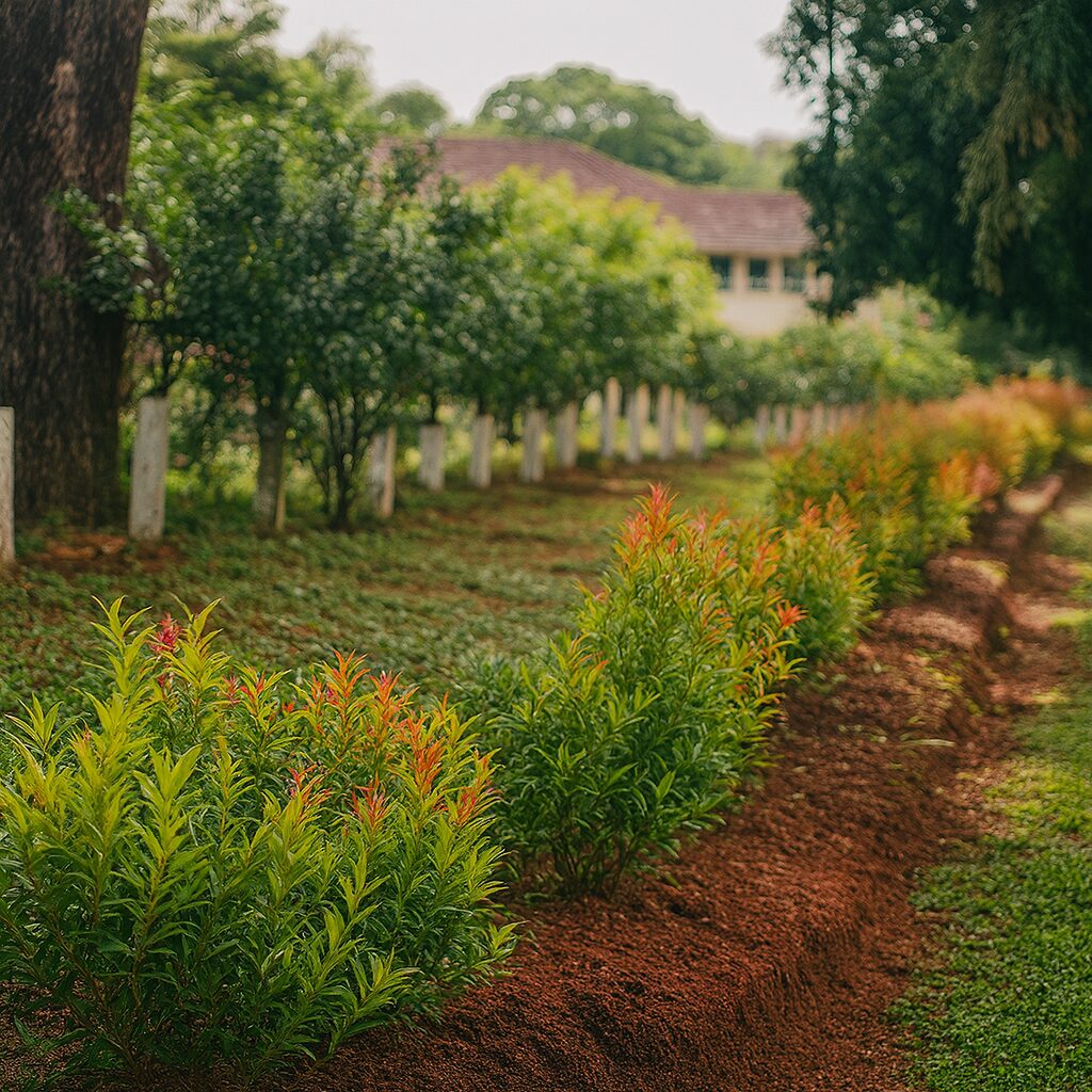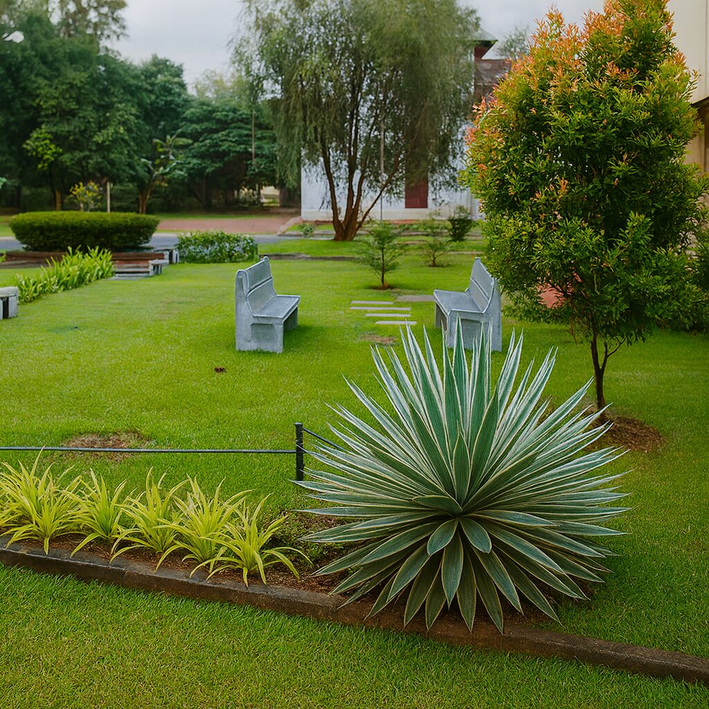 A timeless institutional courtyard landscape designed for Orthodox Theological Seminary, Kottayam, blending the heritage elegance of colonial architecture with the freshness of tropical greenery. The design celebrates serenity and order — creating an inviting environment for reflection, learning, and quiet communion with nature.