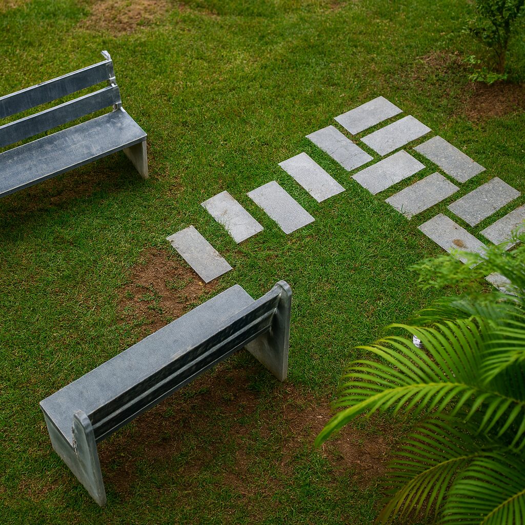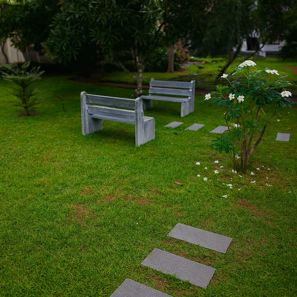 The garden is designed for minimal upkeep — routine mowing, trimming, and bi-monthly fertilization are sufficient to maintain lushness and order.