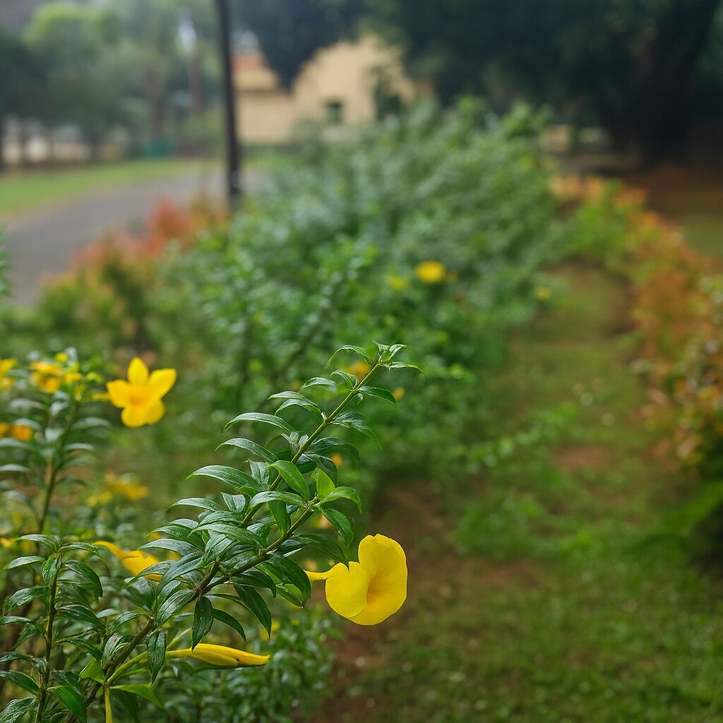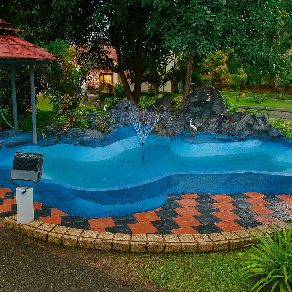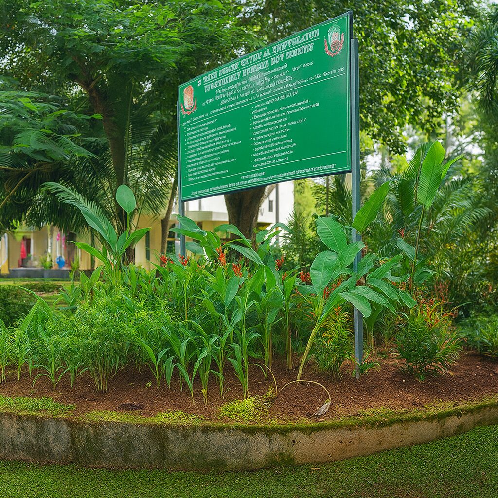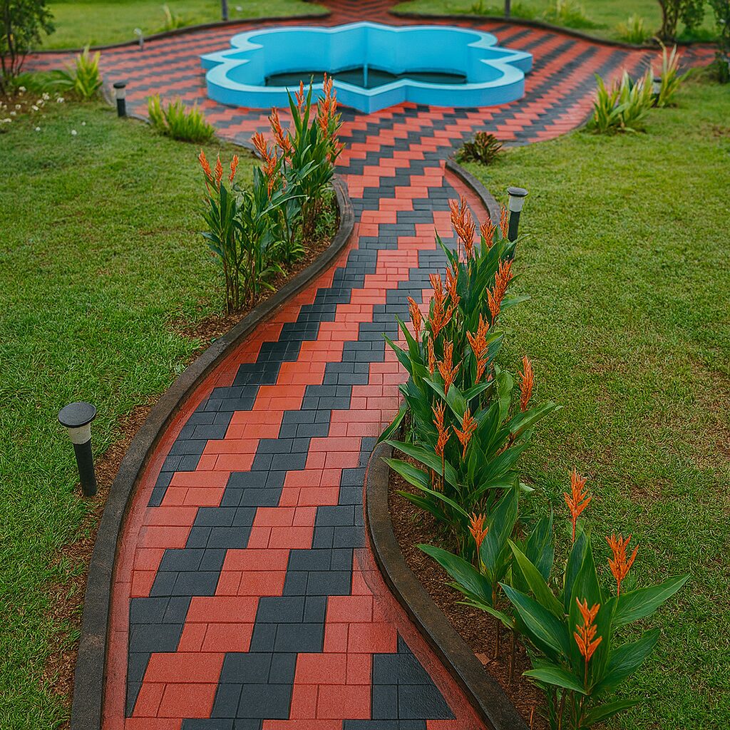 The design includes Heliconia, Allamanda, Crepe Myrtle, Ixora, Dracaena, and variegated foliage plants that thrive in Kerala’s tropical climate and provide color throughout the year.