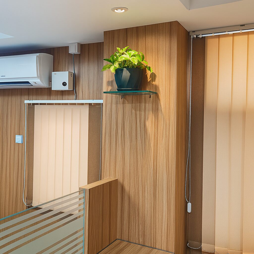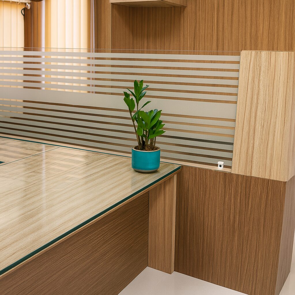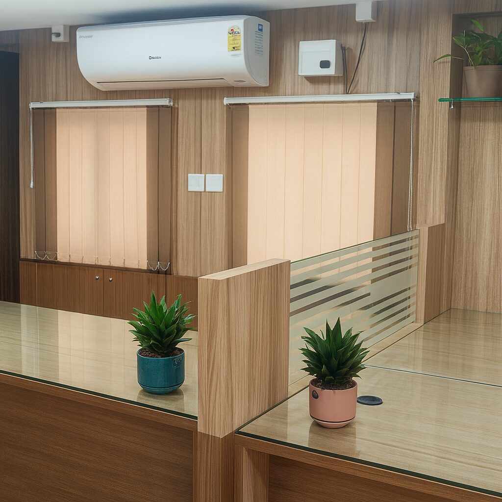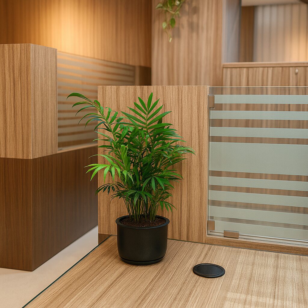 Strategically placed Pothos (Money Plant), Chamaedorea Palm, Aglaonema, and Syngonium enhance the air quality while adding visual warmth to the clean wooden textures and glass elements. The design emphasizes symmetry, minimalism, and greenery, ensuring a balanced visual flow across the reception, cubicles, and waiting zones.