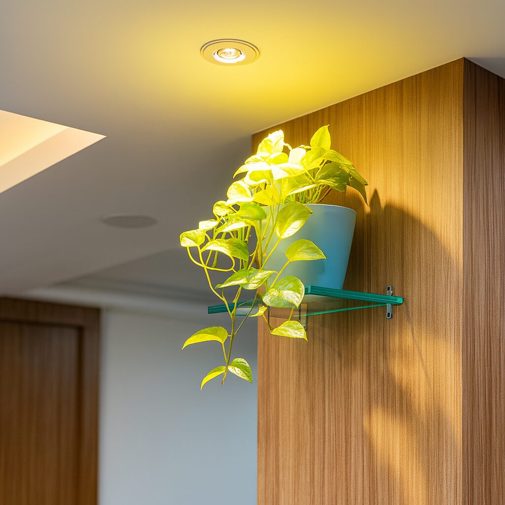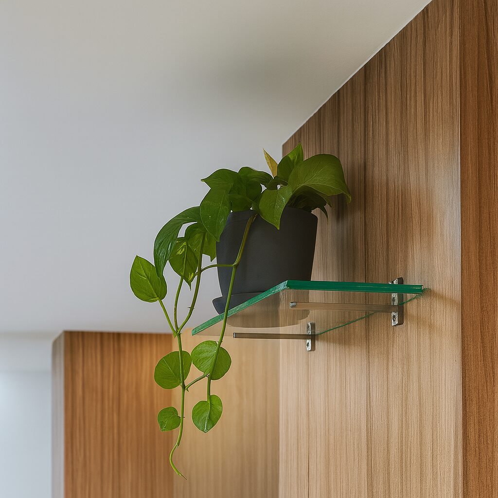 Mounted glass shelves hold cascading Money Plants under soft lighting, while vibrant tabletop planters in ceramic and fiber pots bring color to the workspace. The selection of low-light tolerant species ensures the plants remain lush and healthy with minimal care, perfectly suited for air-conditioned office environments.