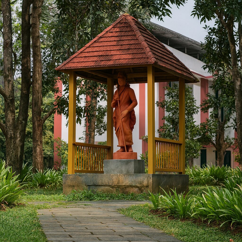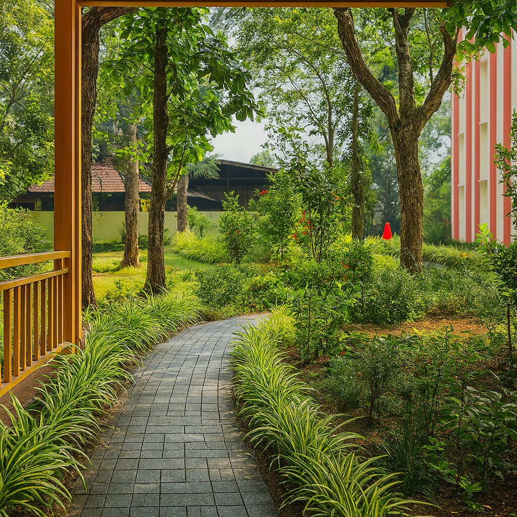 The design draws inspiration from Kerala’s traditional courtyards and temple gardens — reinterpreted to suit an educational institution’s modern context. It embodies peace, order, and respect for nature.