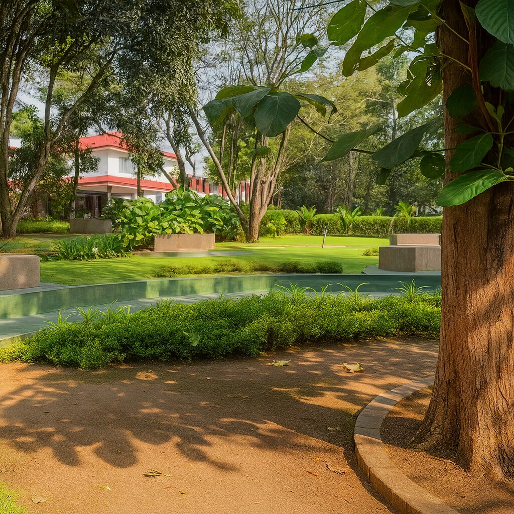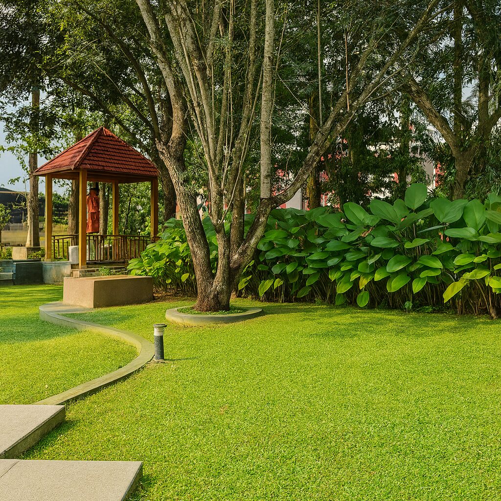 A tranquil and thoughtfully curated green campus designed by Hug A Plant, this project harmonizes structured landscaping with natural serenity — creating spaces that invite reflection, relaxation, and connection with nature. The design blends Kerala’s traditional spatial essence with contemporary landscape geometry, enhancing both functionality and visual balance across the expansive campus grounds.
